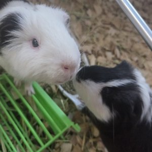 2 bonded female guinea pigs. They are mother and daughter. Mother is adult roughly 2 years old and daughter is 1 year old.