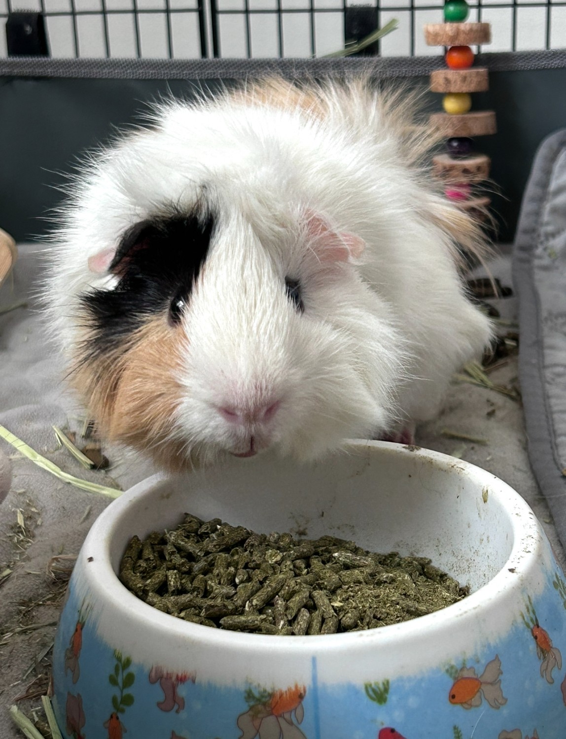 Unfortunately Pepper is no longer getting along with his friend. They have had a few arguments here and there but always made up. Unfortunately, a very bad fight happened yesterday and can no longer be kept together. He is very friendly and loves bell pepper. He is good about having his nails clipped, and we’re just done yesterday. He is about 7 months old. I’m looking to rehome ASAP because I do not have another cage to keep him in and his temporary set up is not practical for him. I would prefer if he went to an experienced guinea pig owner.