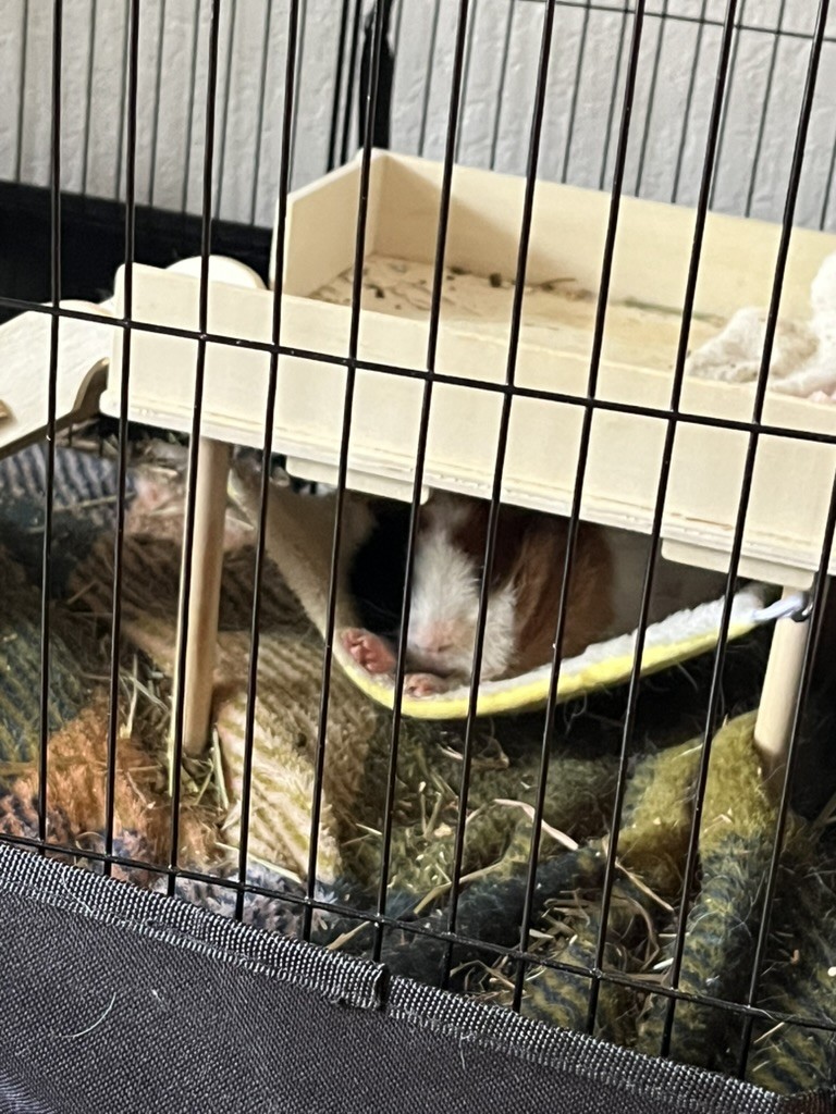 Our lovely piggie needs a new friend! He is a very easy guinea pig to please with treats, but takes a while to warm up to people, and possibly other piggies. Please note he is unfixed! Will need him rehomed before our family leaves the state for his well-being by next Summer. He MUST be re-homed with at least one other piggie.He comes with his hammock and rooftop, hay tunnel, his hanging toys, and whatever is left of what we have in Guinea pig food at the time of adoption.