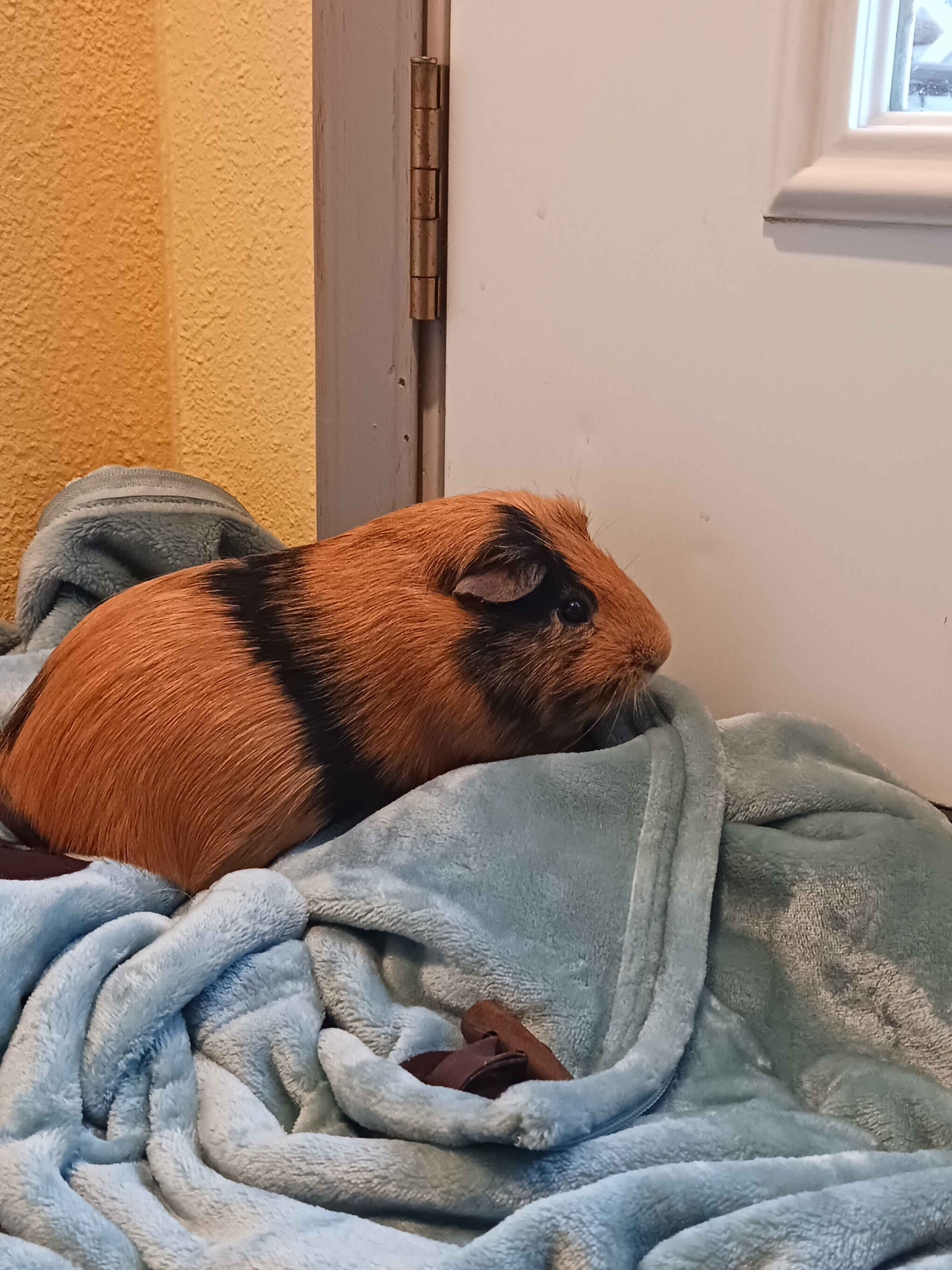 He is a real sweetheart once you get him used to you. He loves piano music, and loves to stand on the highest point in his enclosure. I have a group of outdoor piggies that I have tried to introduce him into, but after a few (bloody) scuffles, I knew the stress would be too much. He can probably get along with other males, but will likely need to be neutered. Solo he has a great temperament, but pigs are very social, so he'll likely need a cage mate eventually. Text or call, or email me at Kirinky@proton.me