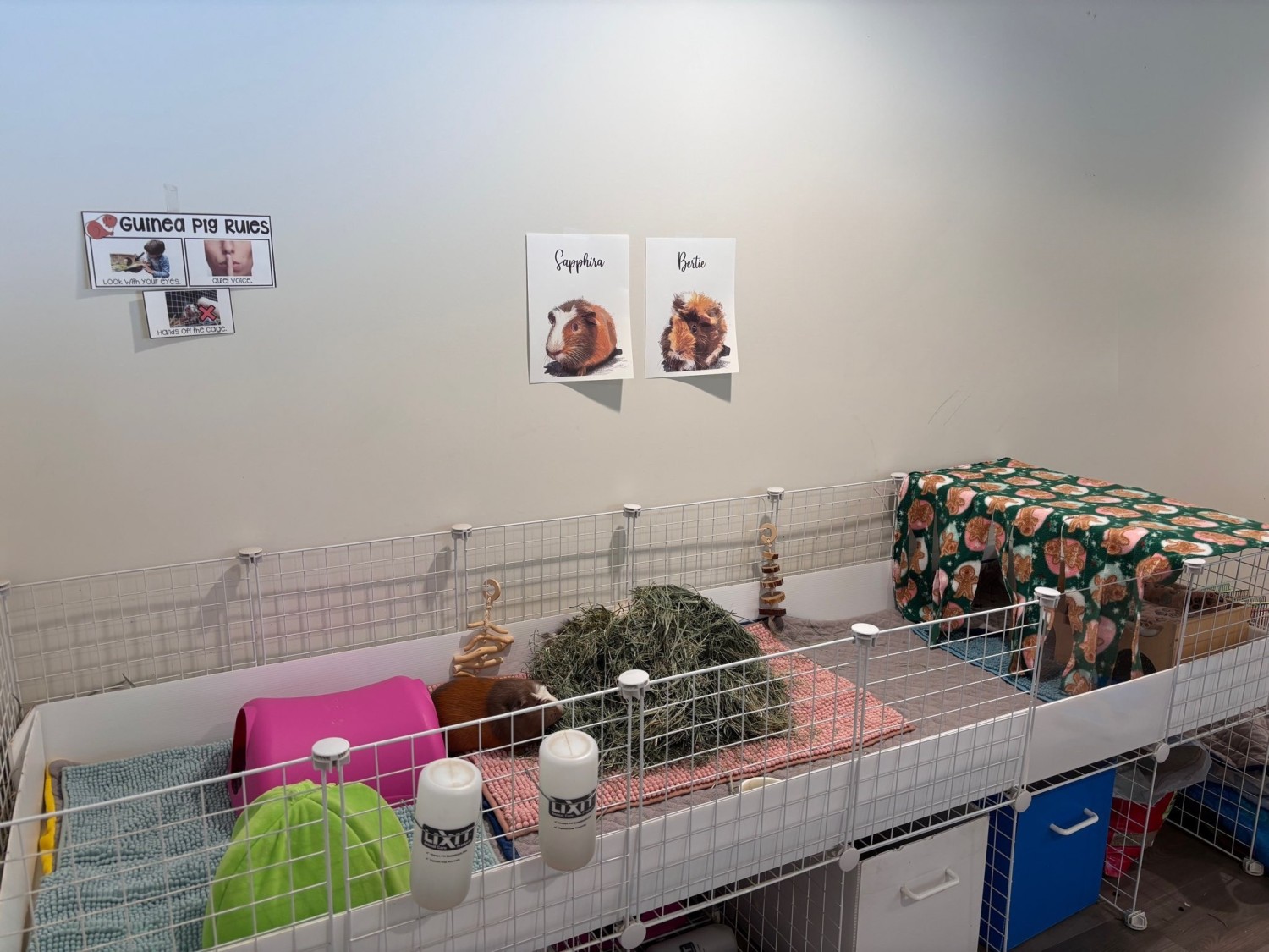 We adopted Bertie and Sapphira a little over a year ago from a rescue. They are both 2 years old and very sweet. They will need a lot of time to warm up to a new family. They love large piles of hay, cozy hideouts and pea flakes. They will come with their 6x2 Guinea Pig Cage Co. cage and all their things, which includes liners, pee pads, hideouts, bowls and water bottles.