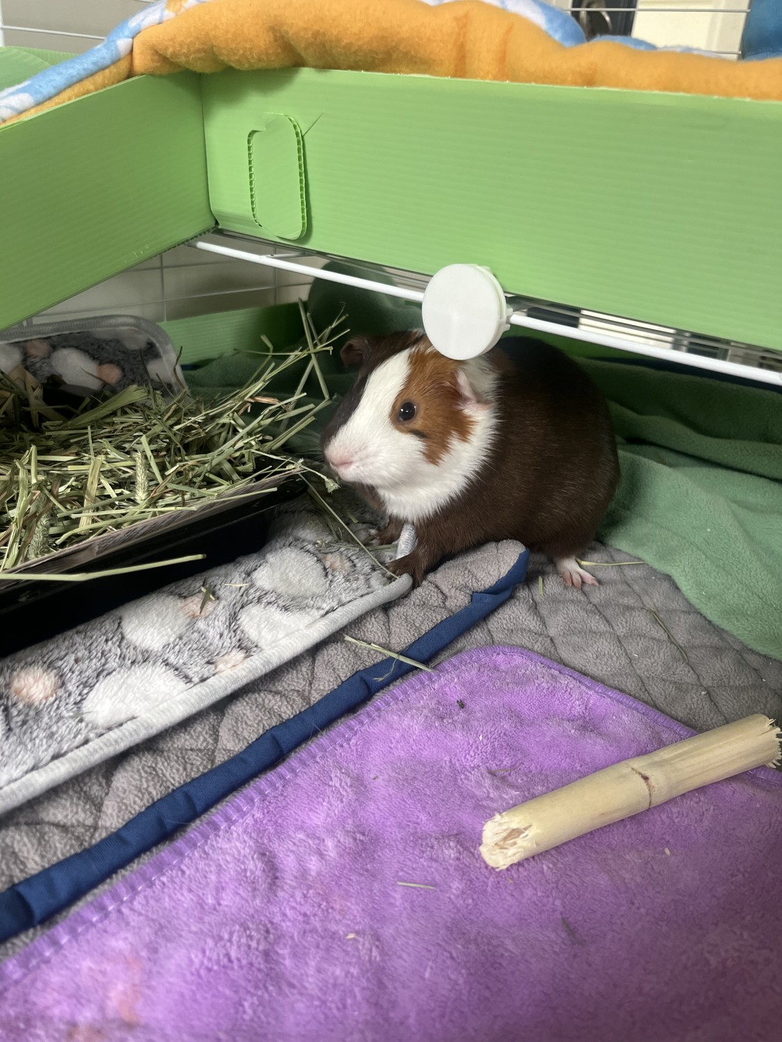 He doesn’t come with an enclosure, as I wasn’t prepared to take in another Guinea pig, and had to use spare enclosure parts from my piggies. But, he does need space and at least a 2x4 enclosure- NO pet store cages.
