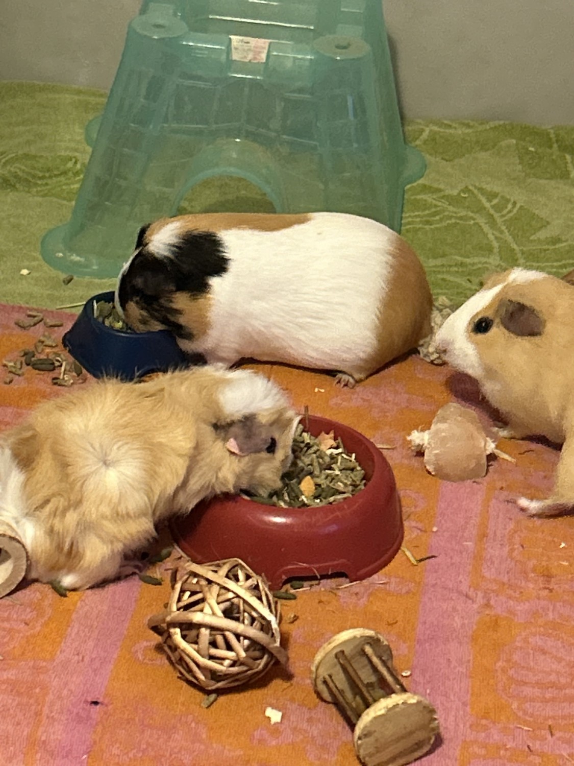 3 guinea pigs, Diamond was a rescue after she was abandoned in a vacant apartment, The other two were adopted to keep company for Diamond, But Diamond seems to not like other guinea pig and is kept next to the two.