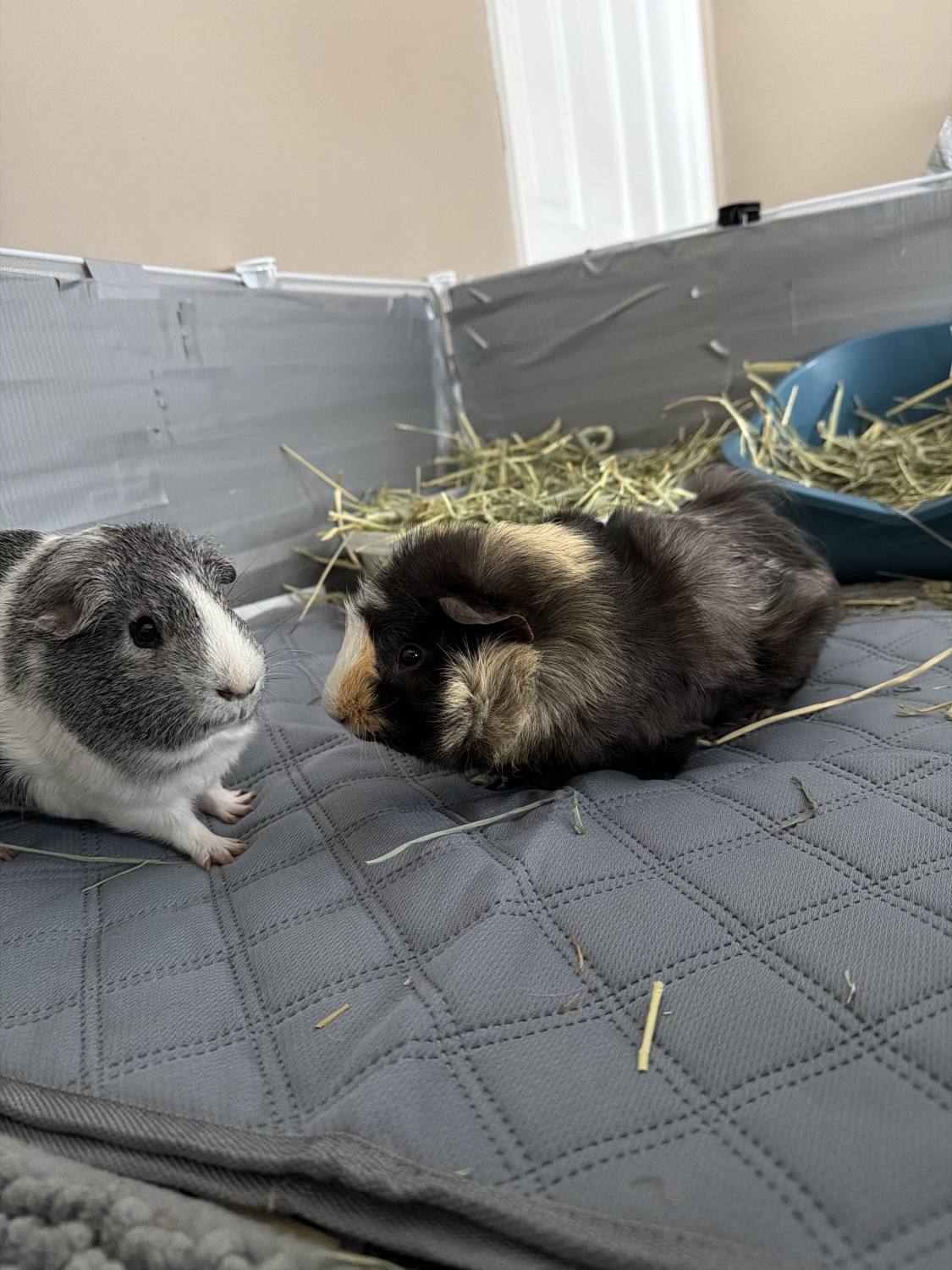 Very friendly guinea pigs, the white/grey one is more curious. They love when you hand feed them. I have C&C grid cages/bedding that i can sell at a discounted price with the pigs.