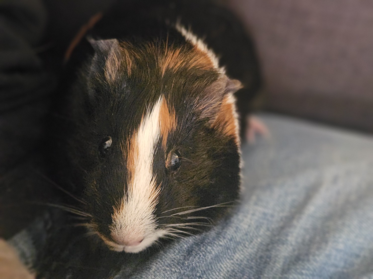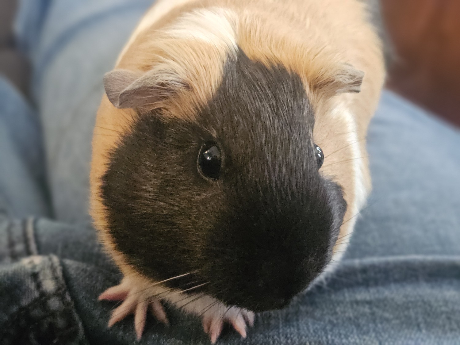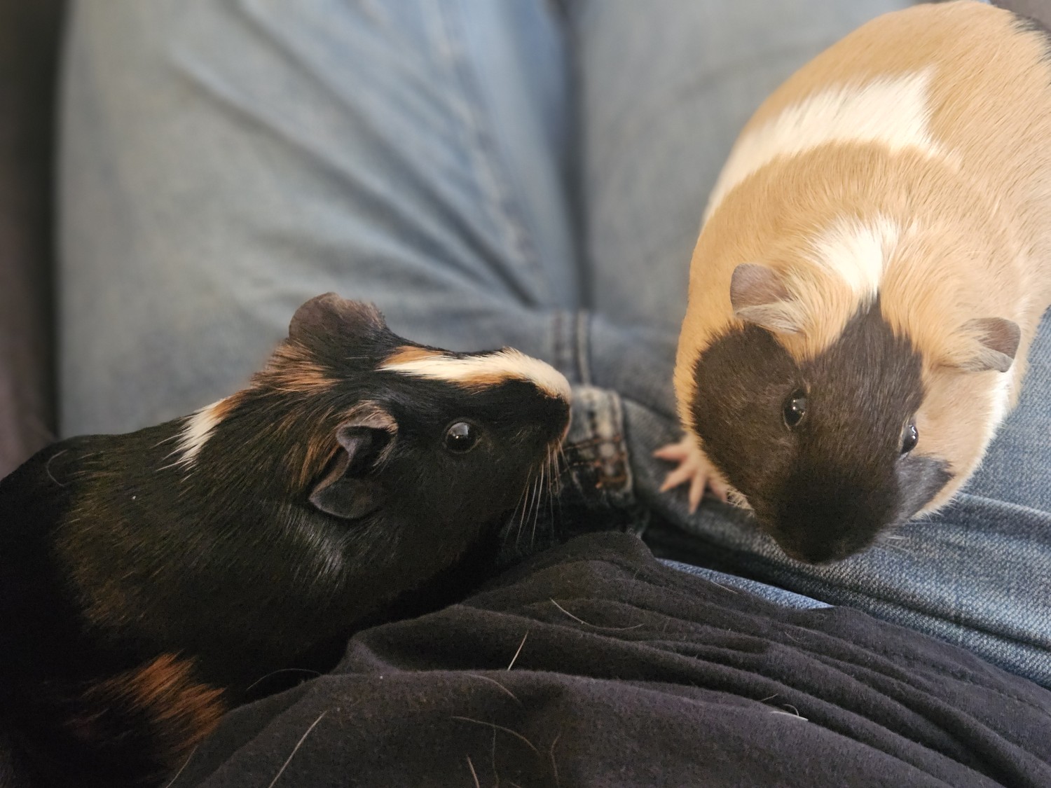 Chocolatey (black) and Unicorny (tan) are about a year old and great friends! They are sweet little piggies. They don’t love being picked up but happily snuggle once they are in your lap.