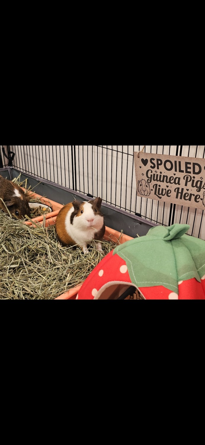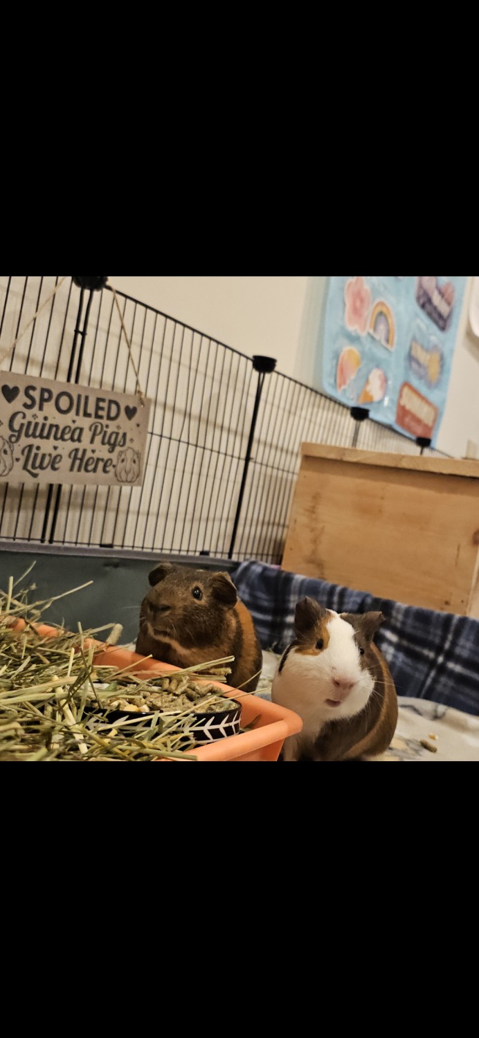 These 2 sweet boys are about a year and a half and are bonded, must stay together. They, like most guinea pigs, run when you try to pick them up, but do well being held once you have them. They do not bite and do well with getting their nails clipped.