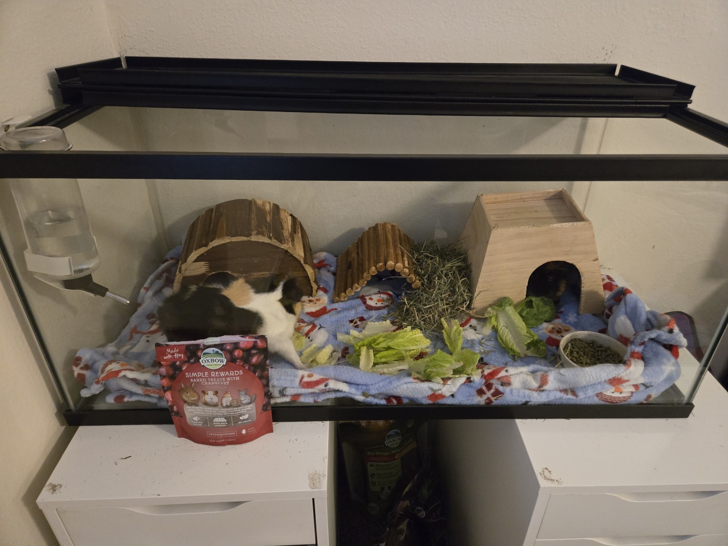These beautiful babies are a bonded pair. They love each other, cuddle and talk to each other and their humans all the time. They are super cuddly and friendly. They need a new loving and beautiful home. They are adolescence with semi long hair. Comes with house, beds, food and hay! They love their vegies and fruits. Please consider taking care of our babies!
