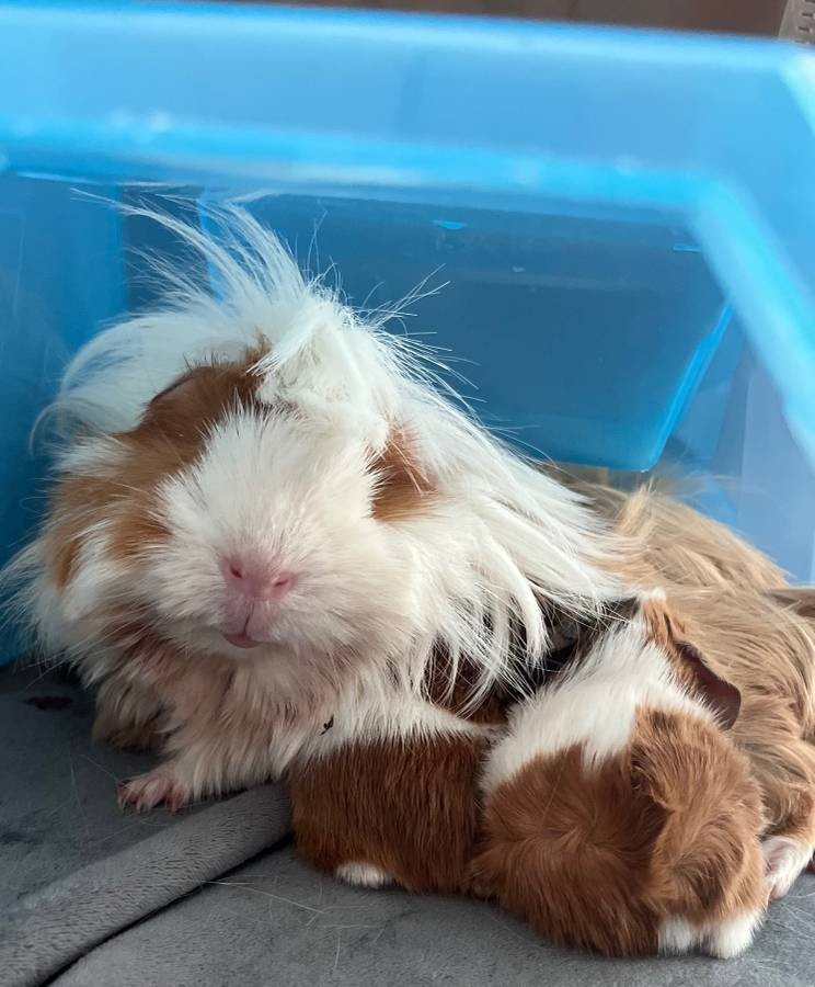 Scoli came to me with her son, Hufflepuff. The previous owner stated that she had another baby, but that they were rehomed. Scoli loves her vegetables and has a unique squeak. She has a memorable hairdo and amazing personality. Eiffel is the copper, Peruvian piggie. She was rehomed to me with her daughter Moonstone. Moonstone is a quick girl that will need some time to warm up to you. She has an adorable squeak! Eiffel is the queen of the cage. She tends to rumble-strut around the cage, making sure that the girls know who’s boss. Eiffel popcorns when she knows hay, veggies, or pellets are coming. This trio is lovable and so fun to watch.