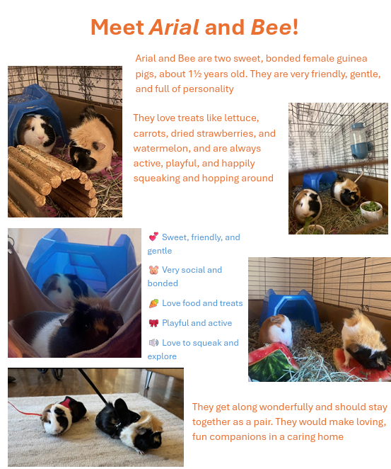 I would really love to find a great home for Bee and Arial, ideally where they could be together. Bee and Arial are super friendly and have never showed aggression towards me or each other. They are very active and like to hop around and squeak.