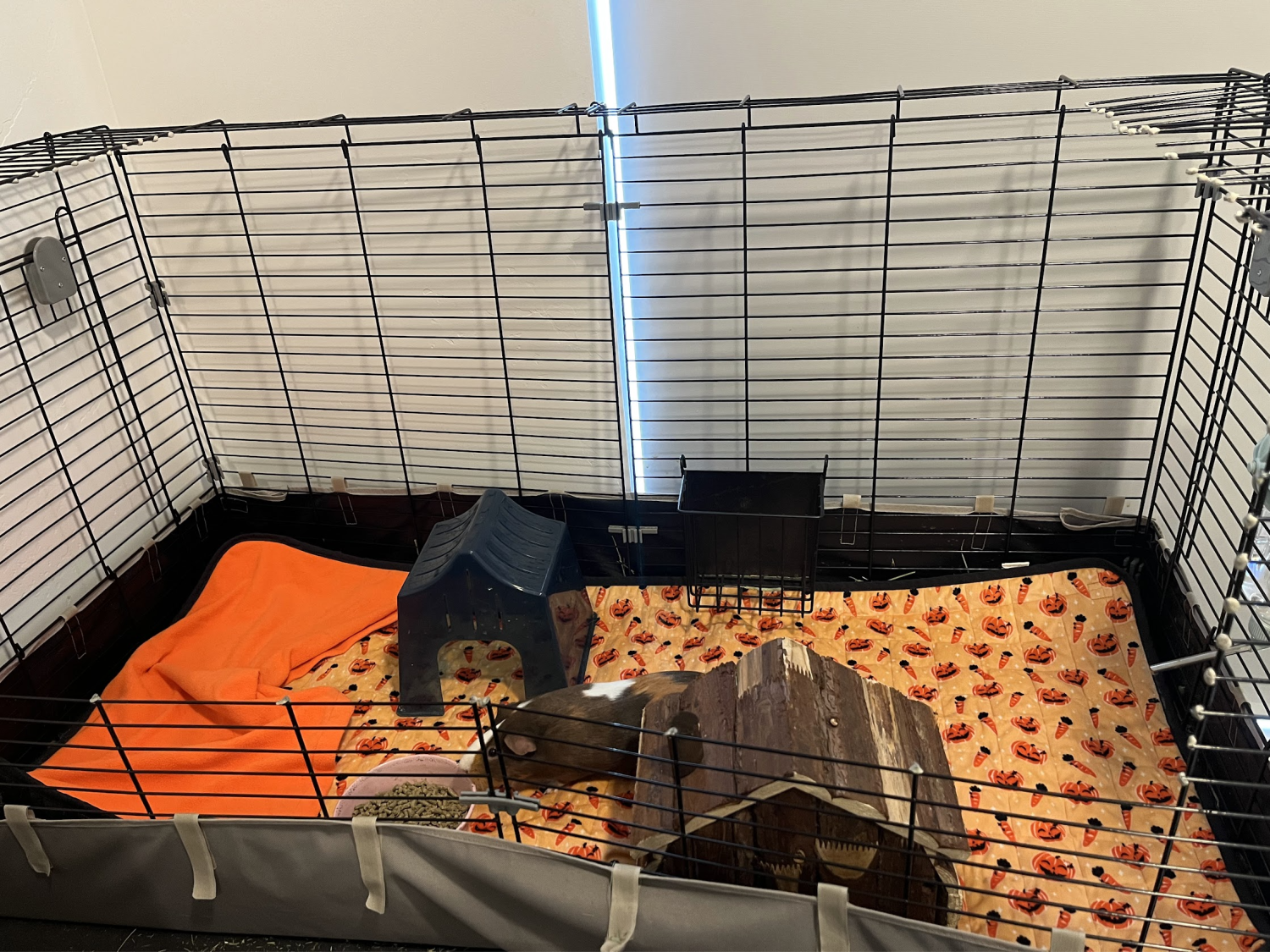 Includes the cage (which we have altered to make taking care of them easier), a water bottle, a fleece mat, hay cage, food bowl, and two houses.