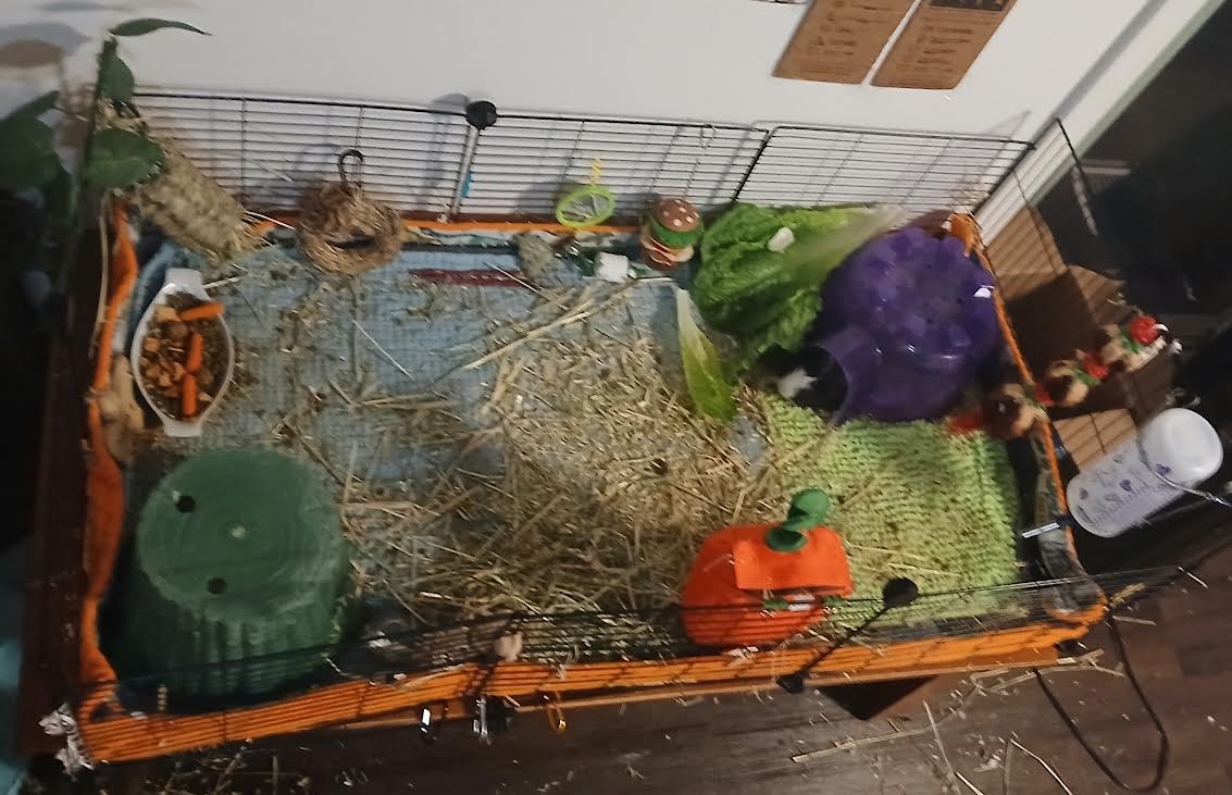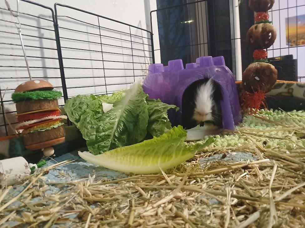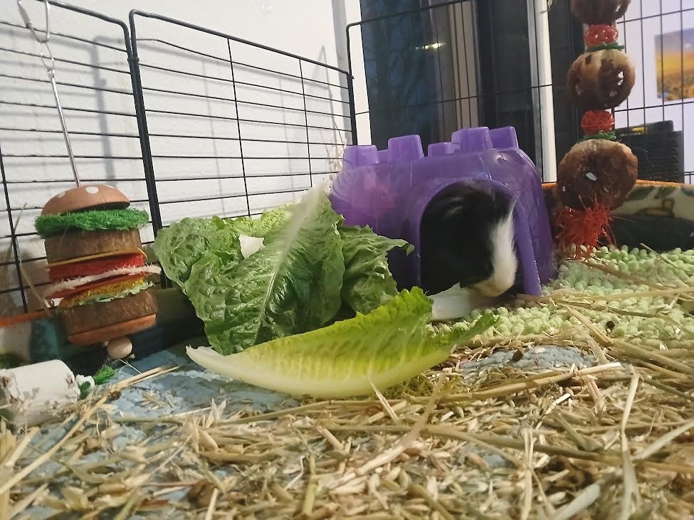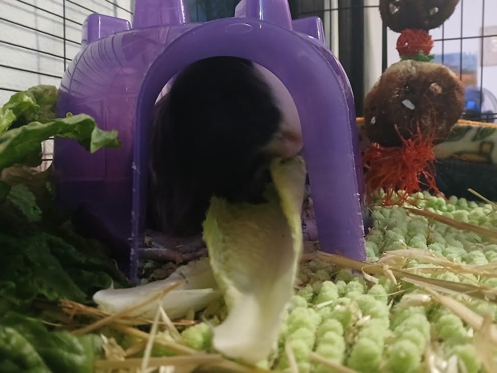 Gergie has a special fascination with paper; I think his trauma from his past abusive owners means that the paper products like toilet paper rolls as toys comfort him. I find he will focus on them exclusively if given the opportunity. He seems to show little interest in enrichment or toy, honestly, he is extremely human-focused and responds most to humans and pigs and social interactions. I have tried everything as far as toys and enrichment and treats and get 3 different types of monthly guinea pig subscription boxes. He only really engages with the timothy toys and seagrass/wicker toys almost exclusively. He does not seem to show interest in most of the extra treat items like the Veggie Burst Chews or Freeze Dried Fruits/Veggies or Peas and Carrot Flakes, or other Rosewood treats. He is a picky eater and refuses rainbow organic cherry tomatoes every time. He will eat herbs like organic cilantro and organic parsley. He will eat carrot tops and a little bit of baby rainbow organic carrots. He primarily loves leafy greens. He needs 5 of the biggest, greenest outer leaves of the head of the organic romaine lettuce every day. He will eat them up fast and beg for more with loud, shrill wheeking, as if he will die without just one more leaf.