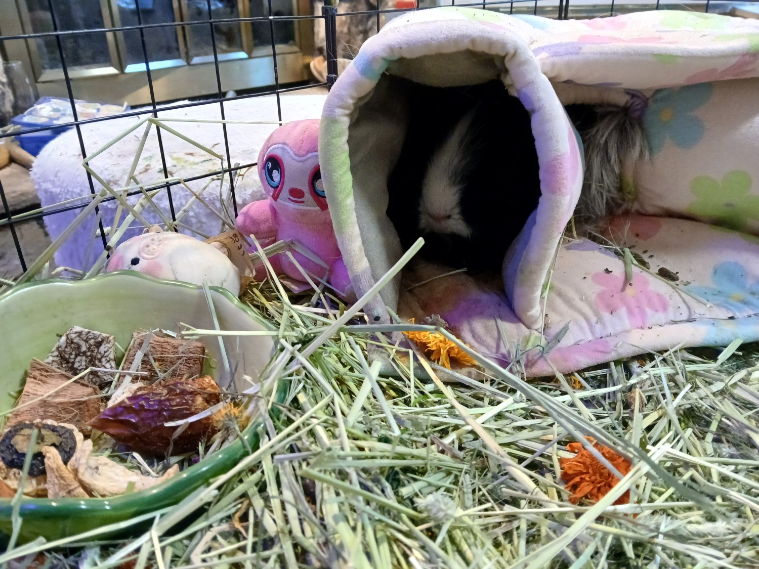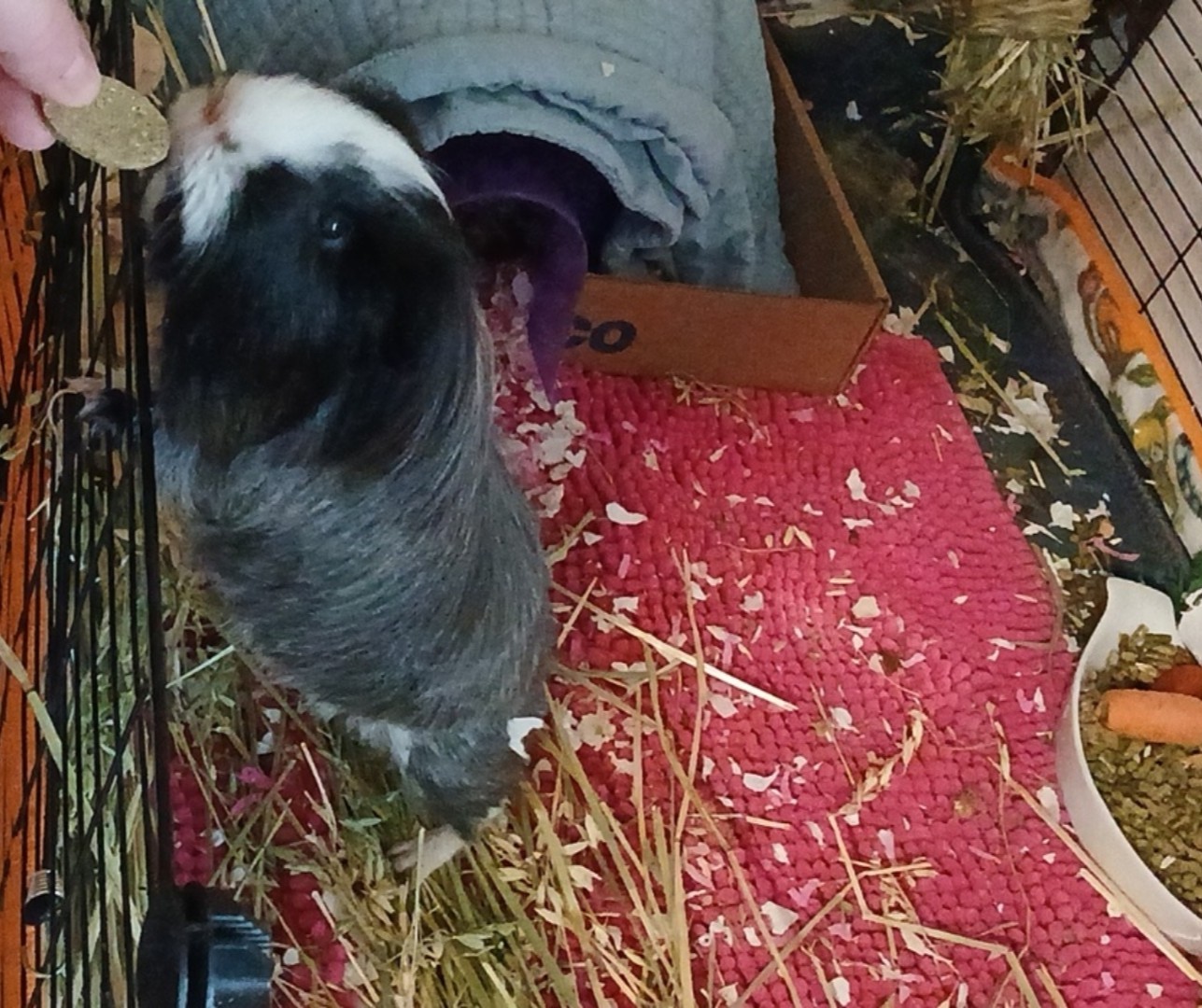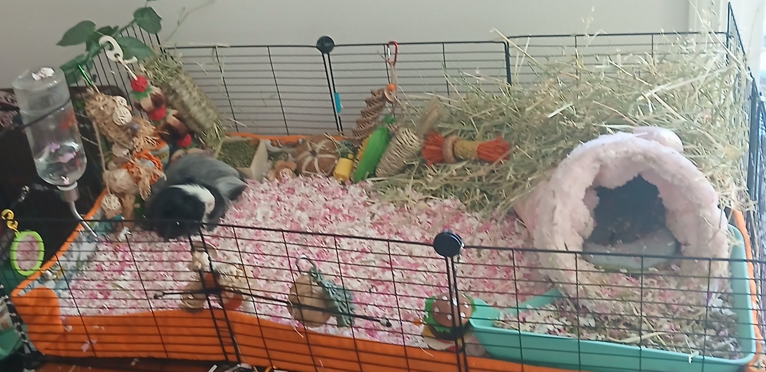Gergie has a special fascination with paper; I think his trauma from his past abusive owners means that the paper products like toilet paper rolls as toys comfort him. I find he will focus on them exclusively if given the opportunity. He seems to show little interest in enrichment or toy, honestly, he is extremely human-focused and responds most to humans and pigs and social interactions. I have tried everything as far as toys and enrichment and treats and get 3 different types of monthly guinea pig subscription boxes. He only really engages with the timothy toys and seagrass/wicker toys almost exclusively. He does not seem to show interest in most of the extra treat items like the Veggie Burst Chews or Freeze Dried Fruits/Veggies or Peas and Carrot Flakes, or other Rosewood treats. He is a picky eater and refuses rainbow organic cherry tomatoes every time. He will eat herbs like organic cilantro and organic parsley. He will eat carrot tops and a little bit of baby rainbow organic carrots. He primarily loves leafy greens. He needs 5 of the biggest, greenest outer leaves of the head of the organic romaine lettuce every day. He will eat them up fast and beg for more with loud, shrill wheeking, as if he will die without just one more leaf.
