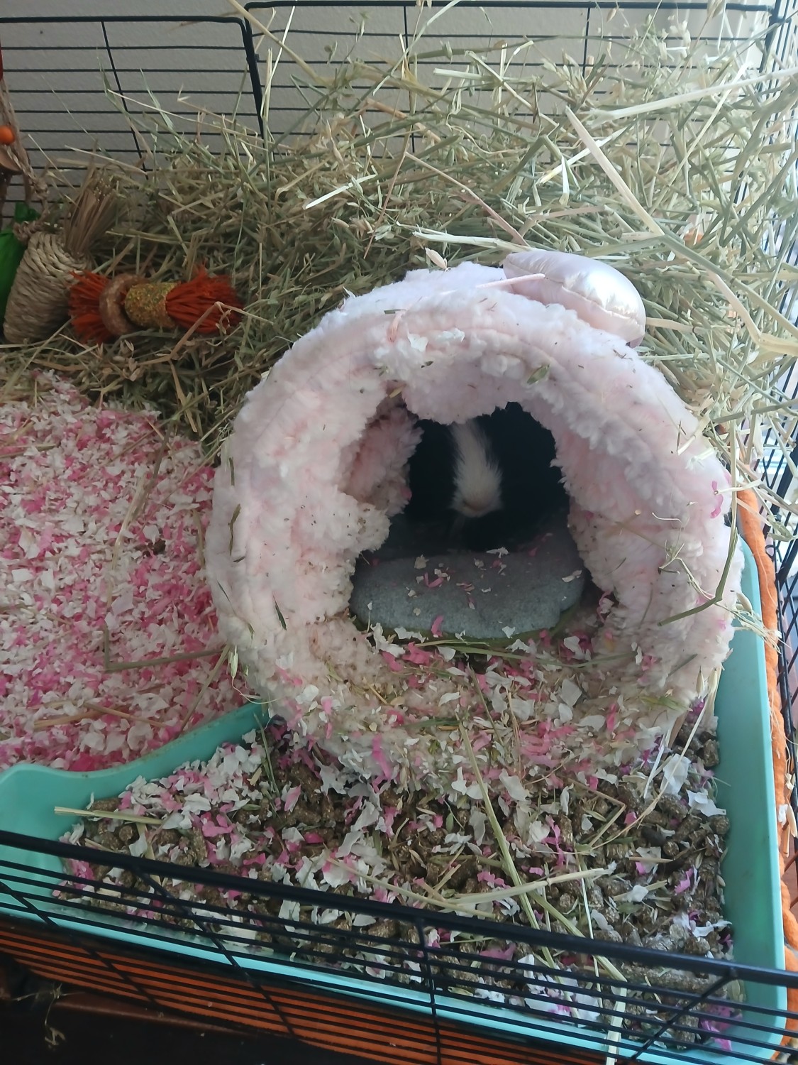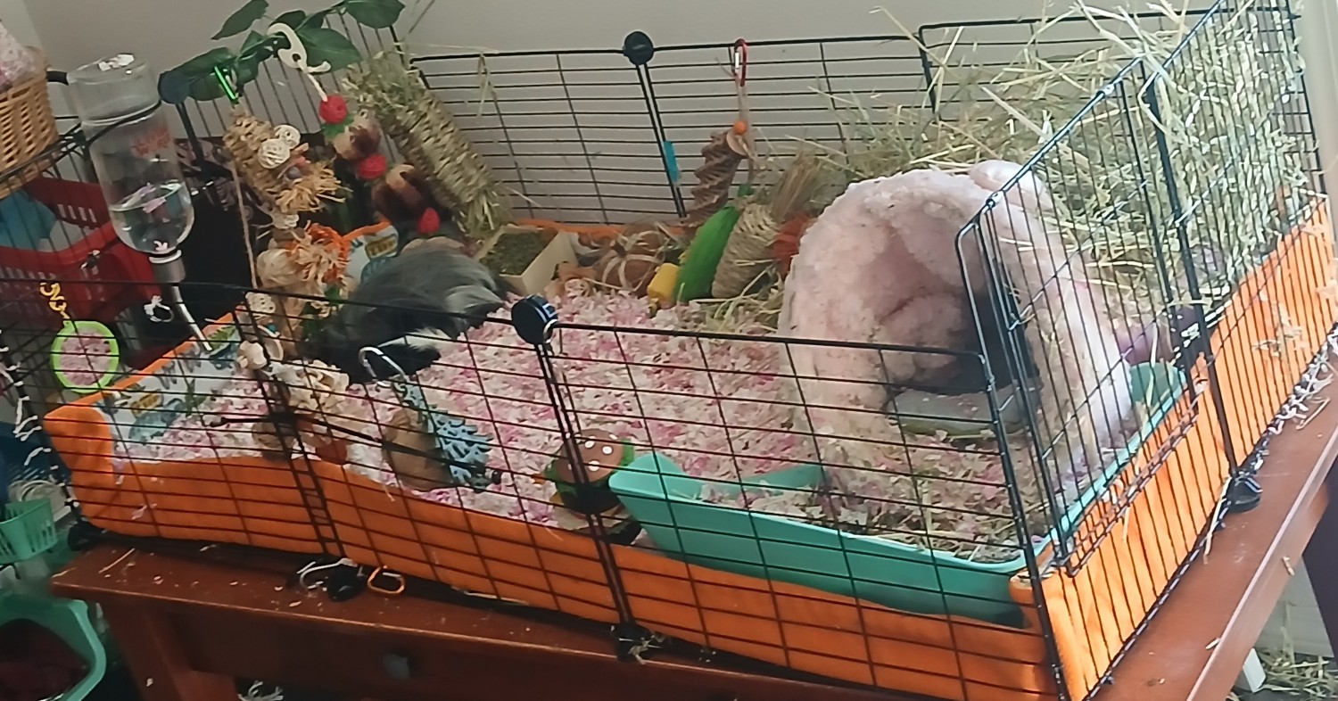 Because of his impaction, he needs to be kept extra sanitary and hygienic. You will spot-clean his cage to remove all the poops three times per day and examine them to discern if his digestion is ok. You will wash his fleece in Free & Clear laundry soap and distilled white vinegar 1 time per week at a minimum. When you wash the fleece, you will do two rinse cycles, not just the standard 1 rinse cycle, to ensure sanitation. No fabric softener sheets. He must have frequent hair cuts around his rear end and his skirt area to keep everything sanitary, about once every 3 months. He needs Small Pet Select Pelleted Hemp Litter on top of his fleece.