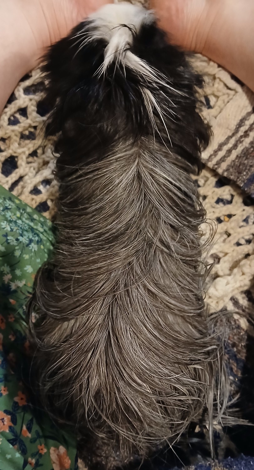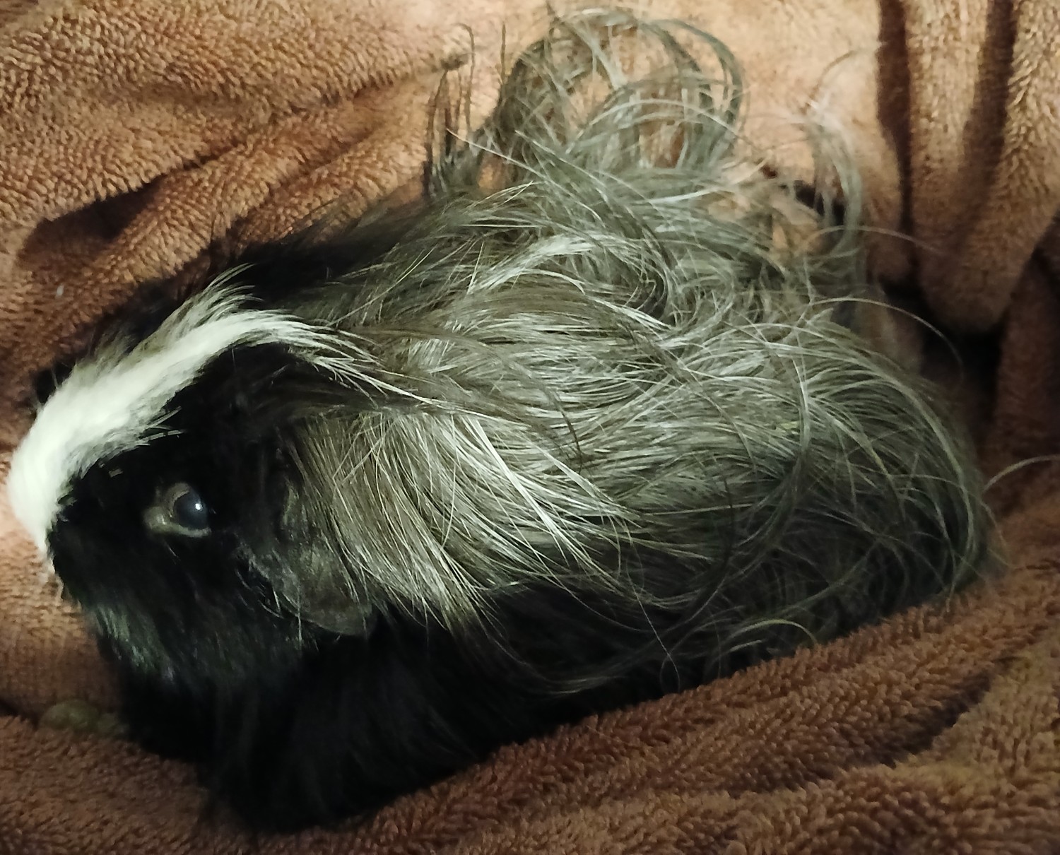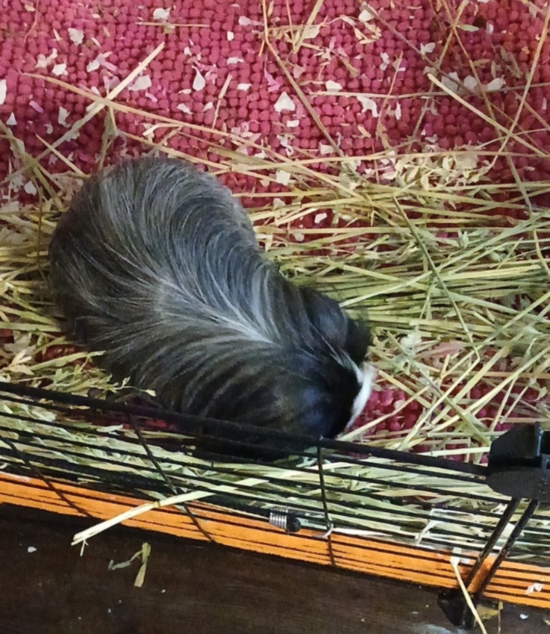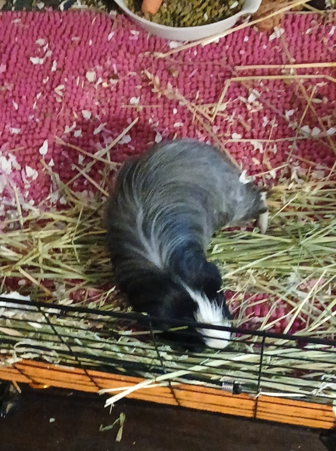 He is a 6-7 year old Silkie Sheltie long hair salt & pepper. He is an intact boar. His soft, shiny fur is black, gray, and white. He has some black skin and paws and even much of his fingernail quick is black, too. Be careful and confident in skill when clipping nails on the black pigmented fingernail quick. He must be bushed every day, especially because of his anal impaction, the fur can get stuck up in his anal impaction if you are not vigilant. He needs a soft, boar bristle brush. He must be brushed gently because of his emaciation. His skin is fragile, but healthy. If you do not brush him very very gently, it will be painful because his spine and tailbone and ribs are showing and easy to feel. He enjoys a C&C cage that is 2x3 to 2x5. He does well with sitting in your lap in freeze mode if you just keep talking to him, but he will definitely scamper if he hears a loud, sudden noise. He gets startled more easily than the rest of my piggies. I would really prefer an owner who is knowledgeable like me about ethically-sourced products for Edgar like those sold at The Dragon Herbarium. Based on his weekly health check, you will alter his herbal blend for his needs. He really enjoys Bob's Red Mill Hemp Hearts, Flax, and Oat products for a special treat.