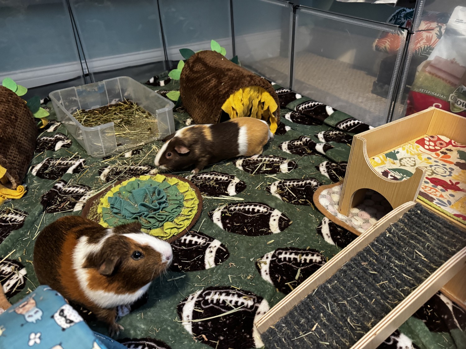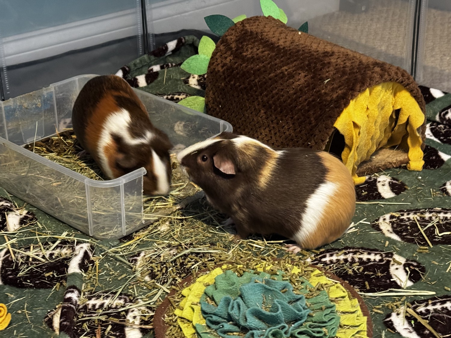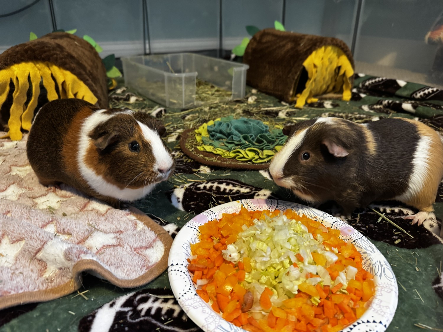 Mocha and Hershey are beautiful and healthy 1 year old short haired American Ginneas. They love fresh veggies and hay. They squeak with happiness when you’re in the room with them and giving them treats.