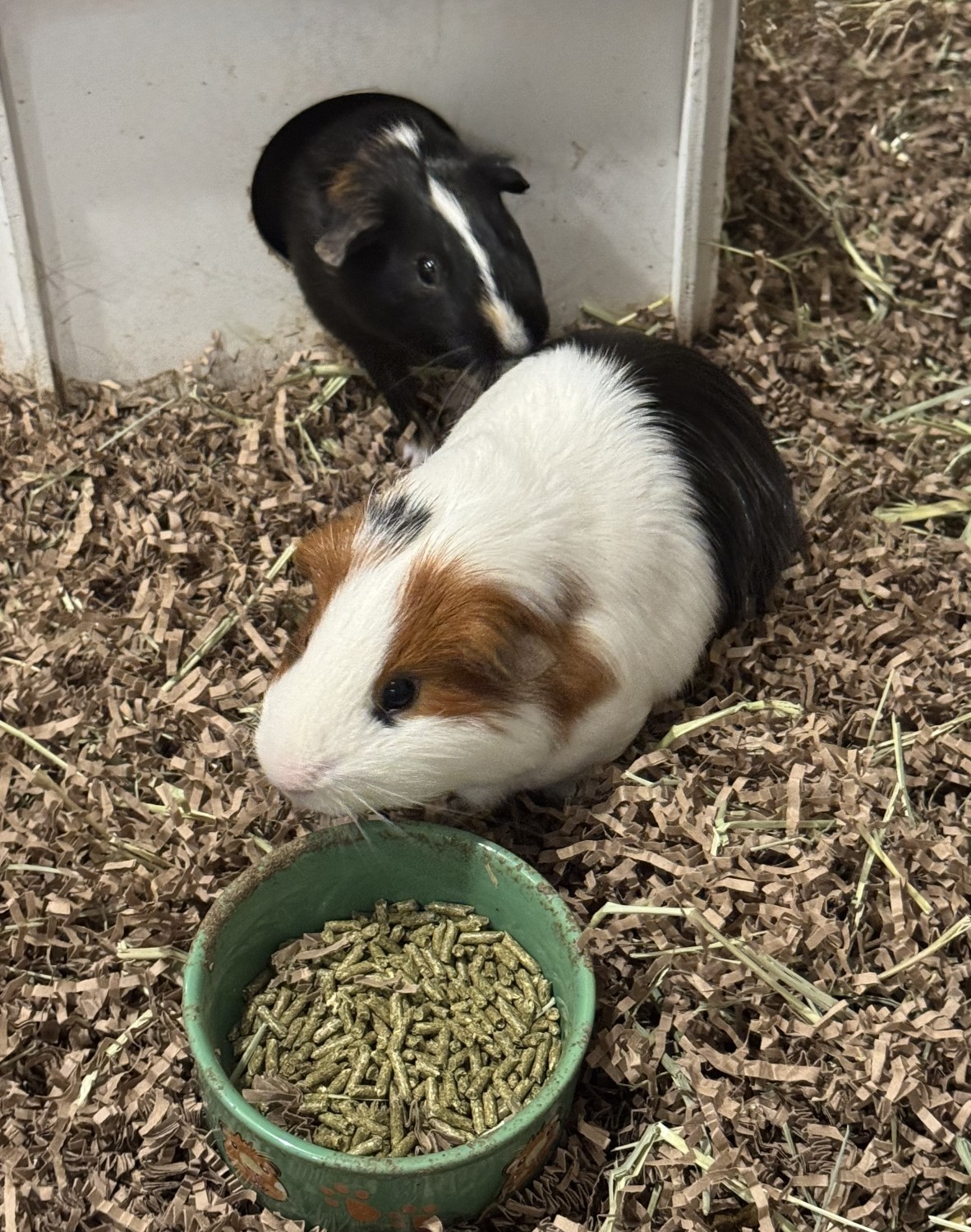 The guinea pigs have been very well taken care. They have a mobile play pen and large elevated cage that is modular. Both come with the guinea pigs.