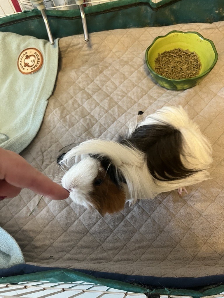 My name is Naomi, and I have loved guinea pigs since elementary school. I got my first guinea pigs when I was 10, and have been taking care of them ever since. Parsnip's older sister, Kiki, an Abyssinian, died earlier this year, and she's been alone since. She would definitely be compatible with other female guinea pigs. She is around 4 years old, cute as can be, and very sweet. She is both sassy and shy, and loves being brushed. Her cage would come with her, as well as her hideaways, and her various chew toys + water bottles. She loves lettuce/kale salads, and takes 10 minutes to take care of, daily. I want her to go to a loving and compassionate home, full of warm snuggles and late night salads.