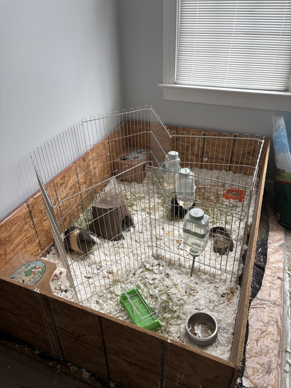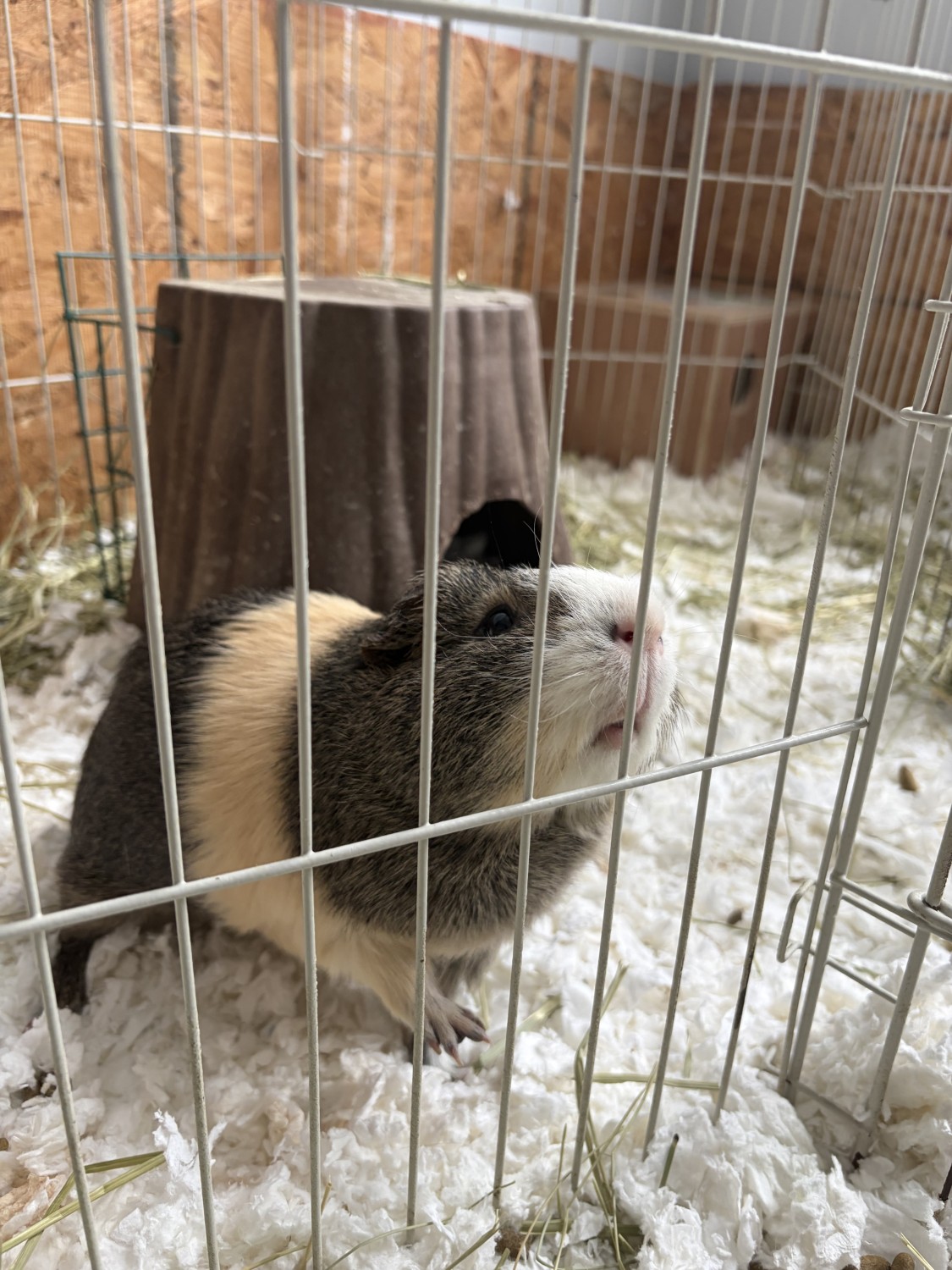 Meet Whiskers (6 yrs), Fox (almost 4 yrs) and Cloudy (almost 4 yrs)! All three are great little pigs with their own personalities. They belong to my two daughters and we’ve had them since they were babies! But unfortunately my one daughter’s allergies have gotten too bad to keep them. We have moved them to different areas of the house and she is on medication, but nothing is working. They each have their own hide-away, hay trough, pellet bowl and water bottle. We also have one cage, a metal divider cage, numerous fleece blankets and a homemade large wooden cage that they all live in now that is all included! You can also have any hay, pellets, and bedding that we have at the time. They currently live separated by the metal cage, but can see and touch each other through it. Whiskers got a parasite when the younger pigs moved in that causes him to be a bit unstable and wobbly, but he requires no different care! We would love for them to find a great home so we can all breathe a little easier 😊