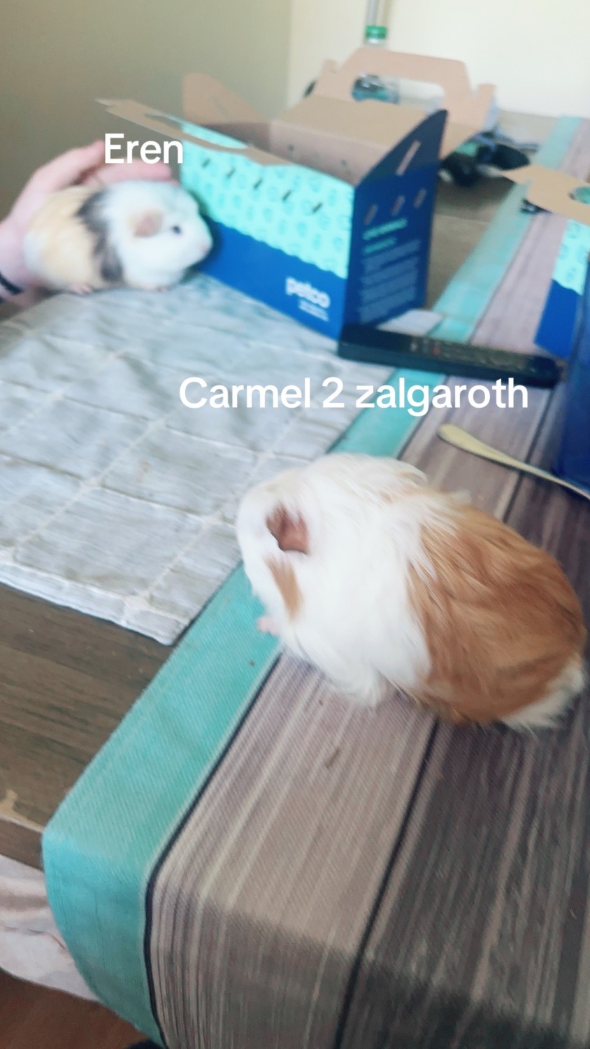 Another photo includes the names of longhair Guinea Carmel 2 (named after a previous one we owned) and Eren Yeager (named after Eren Yeager from attack on titan), however that photo of them is when we first got them, so that’s why they look so small. They’re adult sized now
