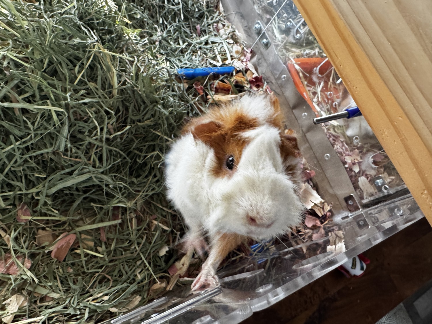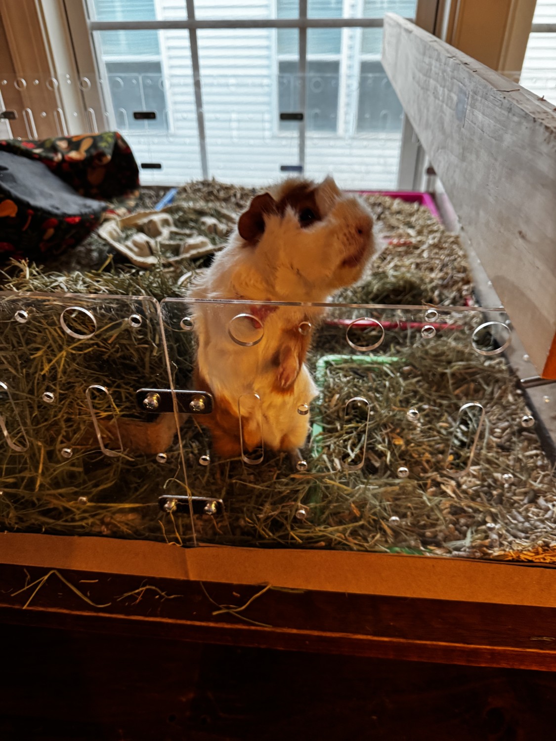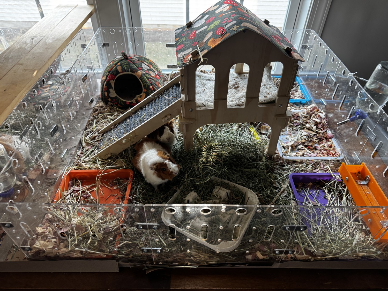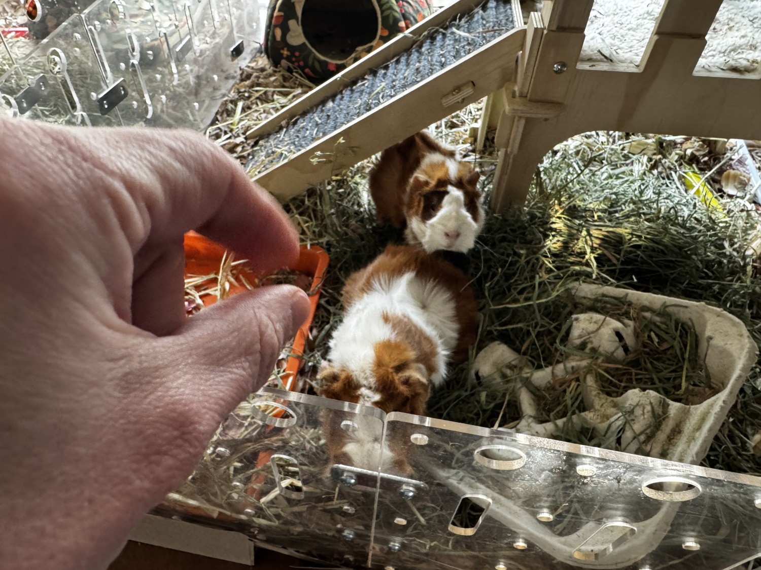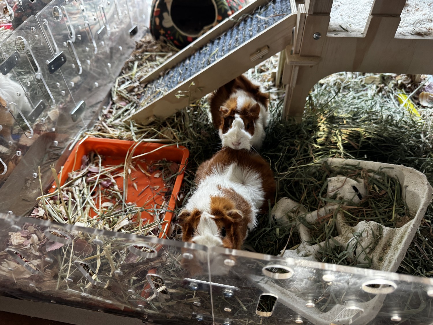 We adopted a pair of baby sisters in Aug. 2025 - one turned out to be pregnant! She had three healthy babies in Oct. 2025. One original sister and one female baby (the niece), a bonded pair, were adopted in Dec. 2025. I currently have the mom and daughter (Rusty and Lila) together in a clear plexiglass habitat - to convey with the piggies - next door to the son (Nino), possibly the cutest guinea pig ever. Nino is very friendly and loves to be pet, although the girls are skittish (though curious). Nino is in an identical habitat abutting his family so that he can see and chat with them. They all live on our dining room table so are very used to human interaction. They would come with all their toys, dishes, bedding, water bottles, etc.