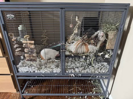 We’ve had them for about 3 years. The short hair one is extremely loving the long hair is a little skittish. They have all supplies you can imagine. 2 story cage. $100 for everything