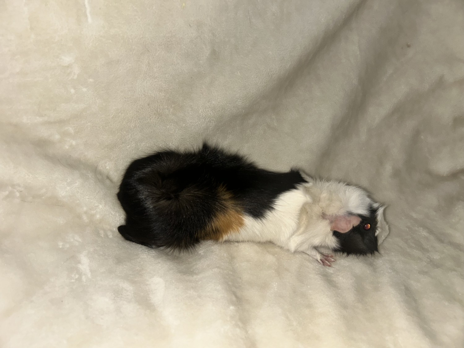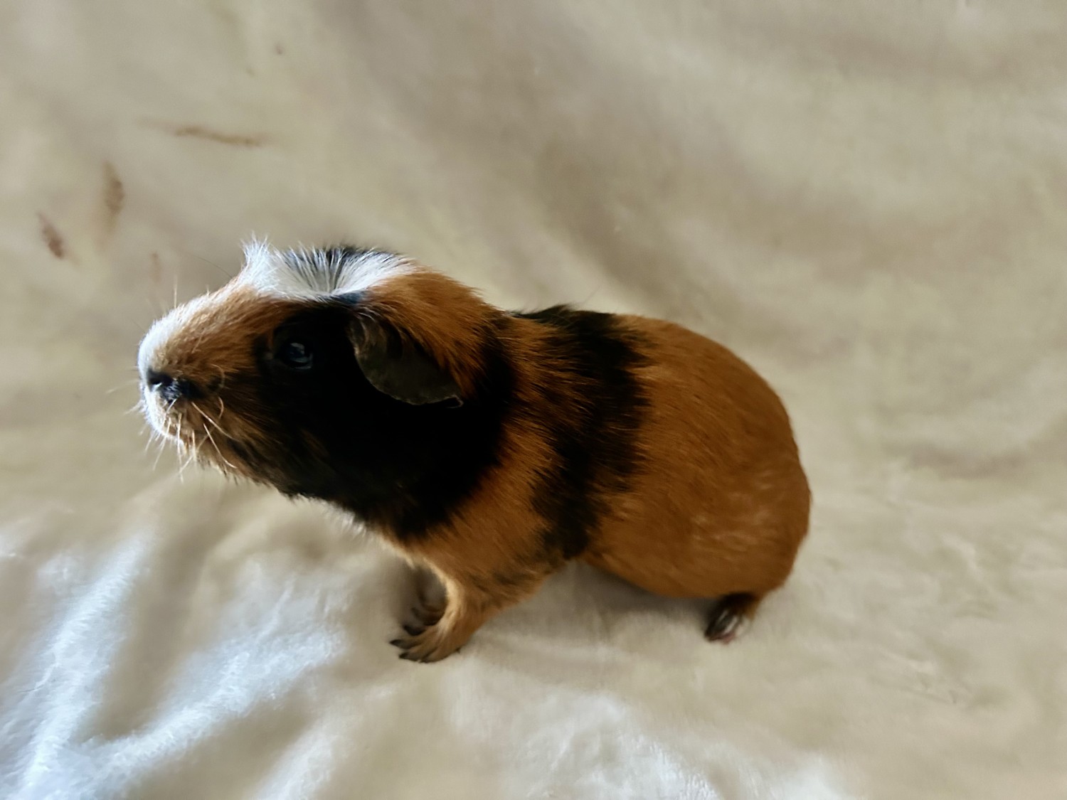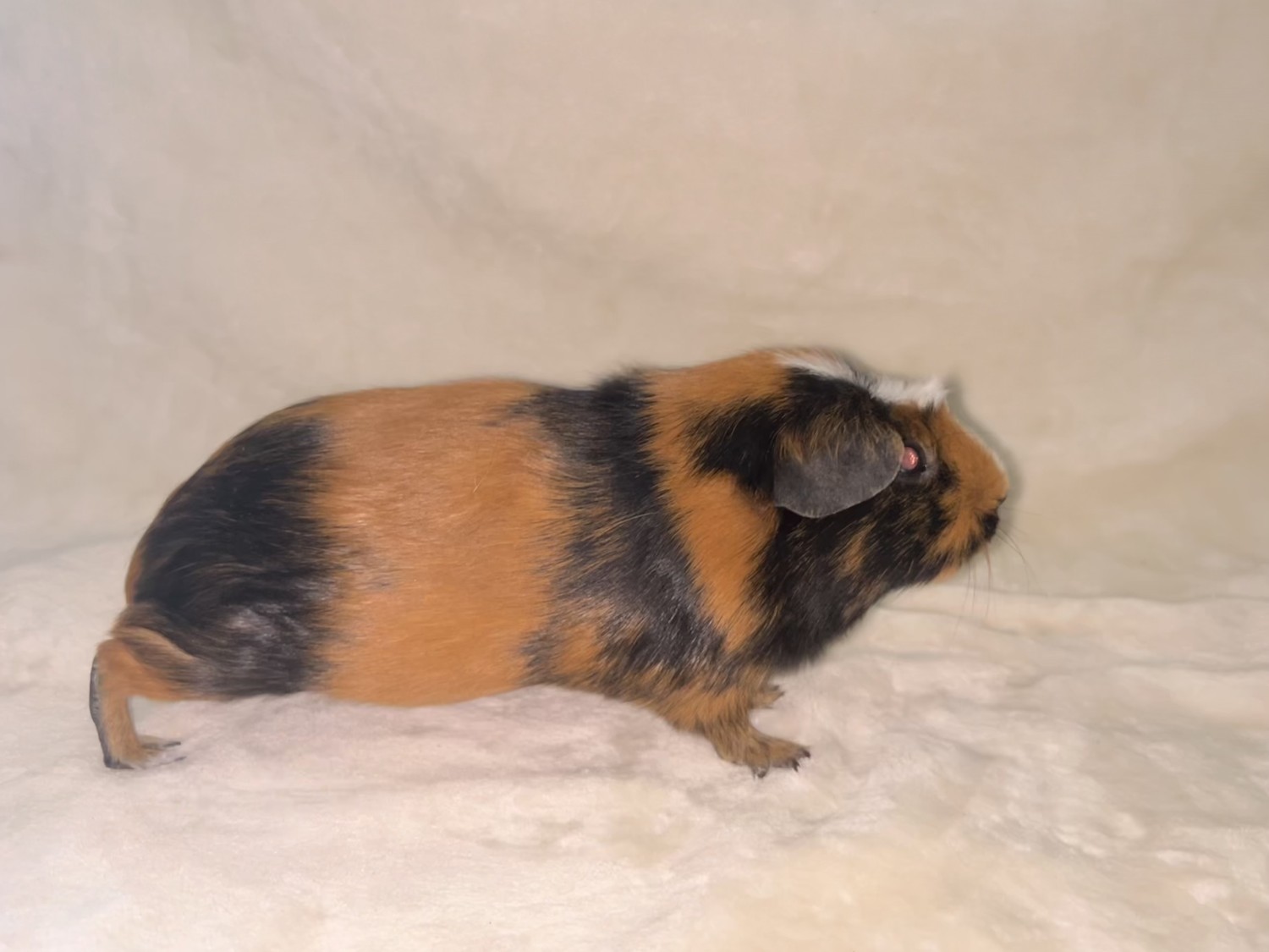-Crested guinea pig with orange, black, and white fur is Swirl. She is 5 years old, going on 6 this July. She moves around as good as ever, although we suspect she may develop issues with her vision. She is a very inquisitive and sweet girl.