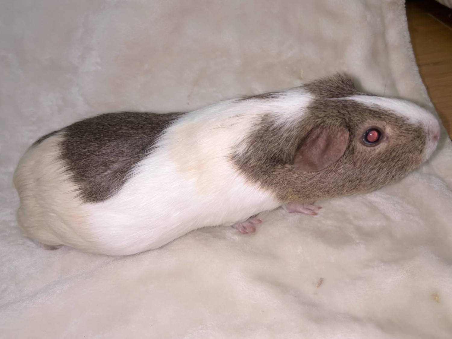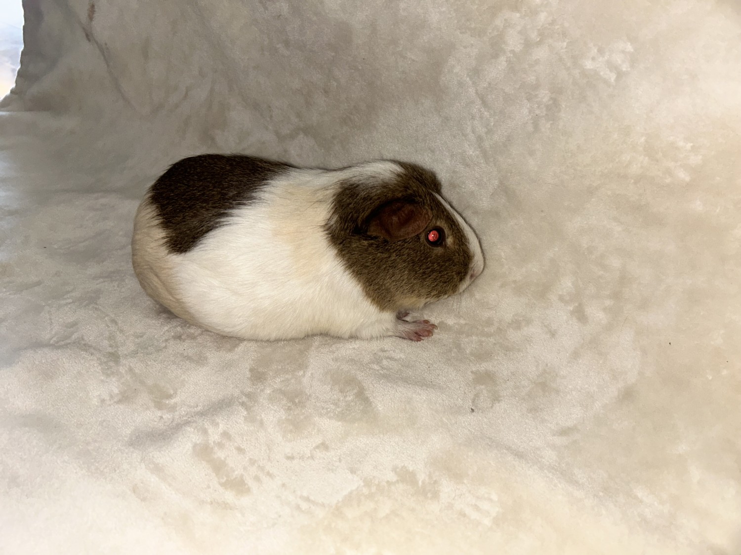 -American guinea pig with tan, brown, and white fur is Mango. She is also 5 years old, going on 6 this July. She still gets around great and we don't anticipate any issues with her. She is very sweet in temperament.