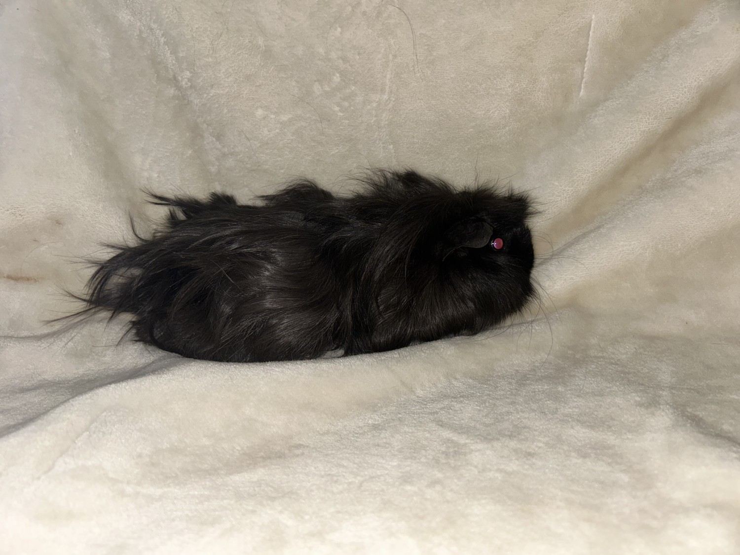 -The long haired guinea pig with black fur is Puff. She is also 9 months old, 1 year in July. She is also young, and very docile and gentle in nature.