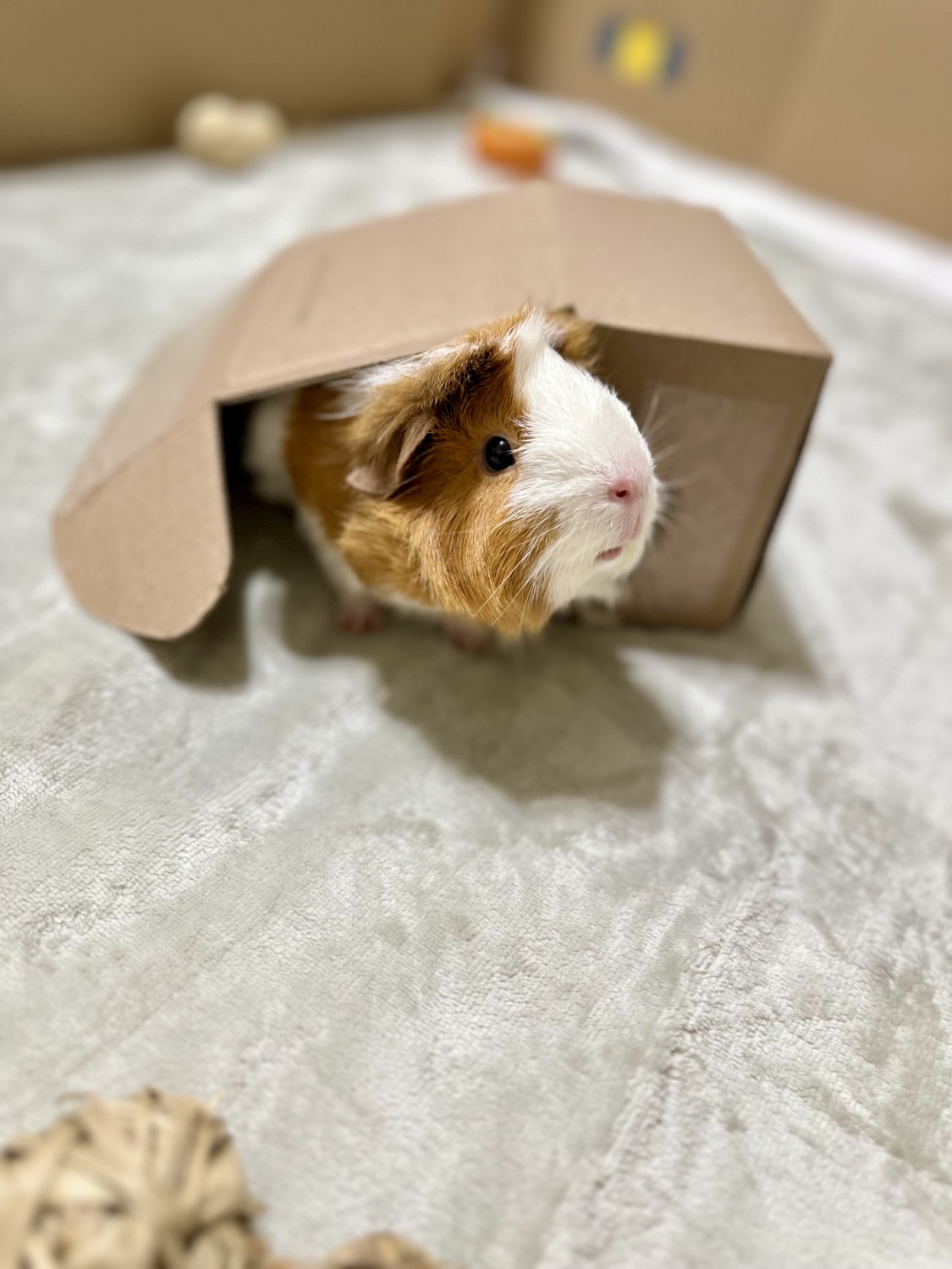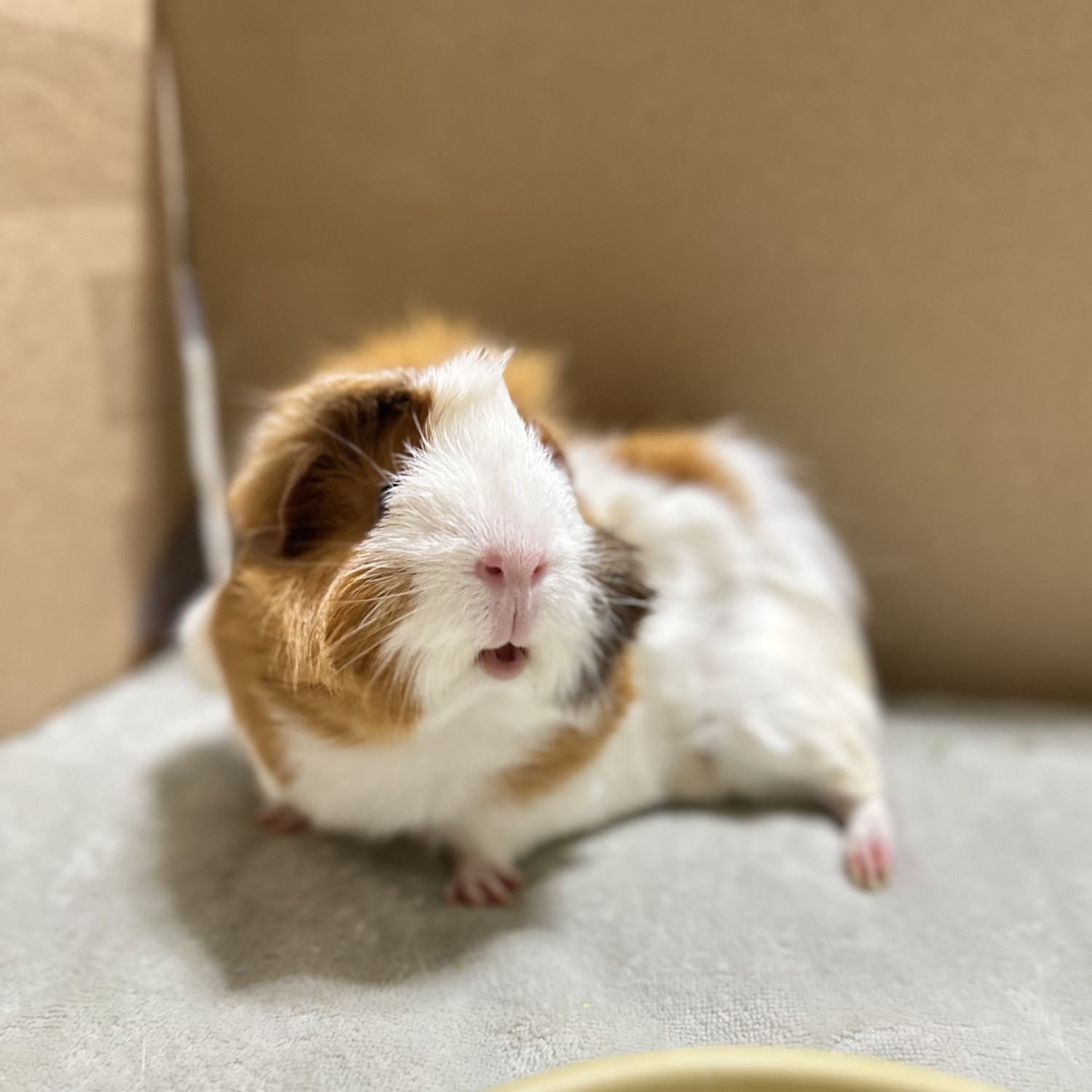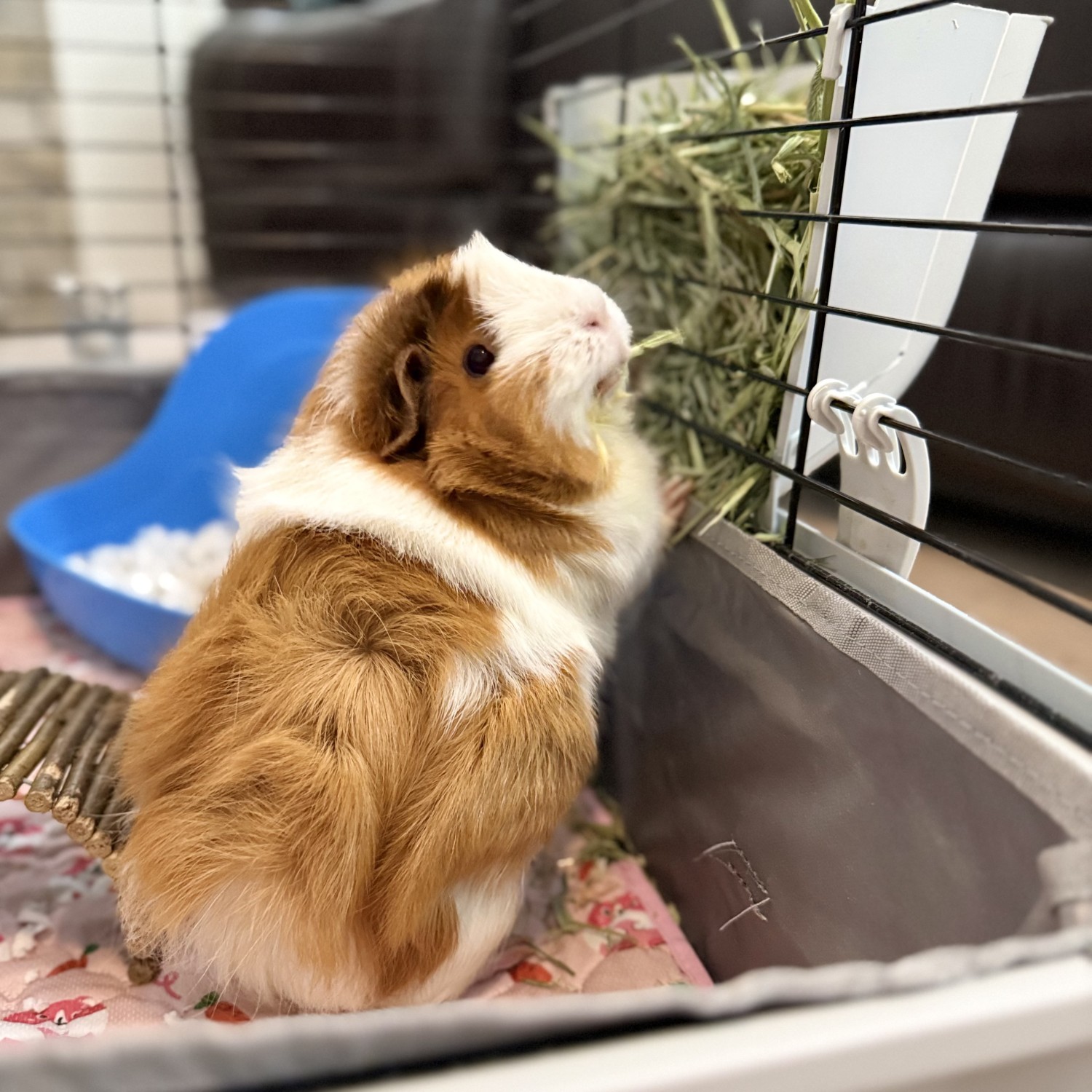 Cookie (with the ginger and brown patches) is around 5 years old and was rescued via a neighborhood Facebook group. She was without a friend and had much too small of a cage, so we upgraded her home, got her a sister, and they bonded immediately. Cookie’s chutting and wheeking increased 100 fold and she has been so happy ever since.