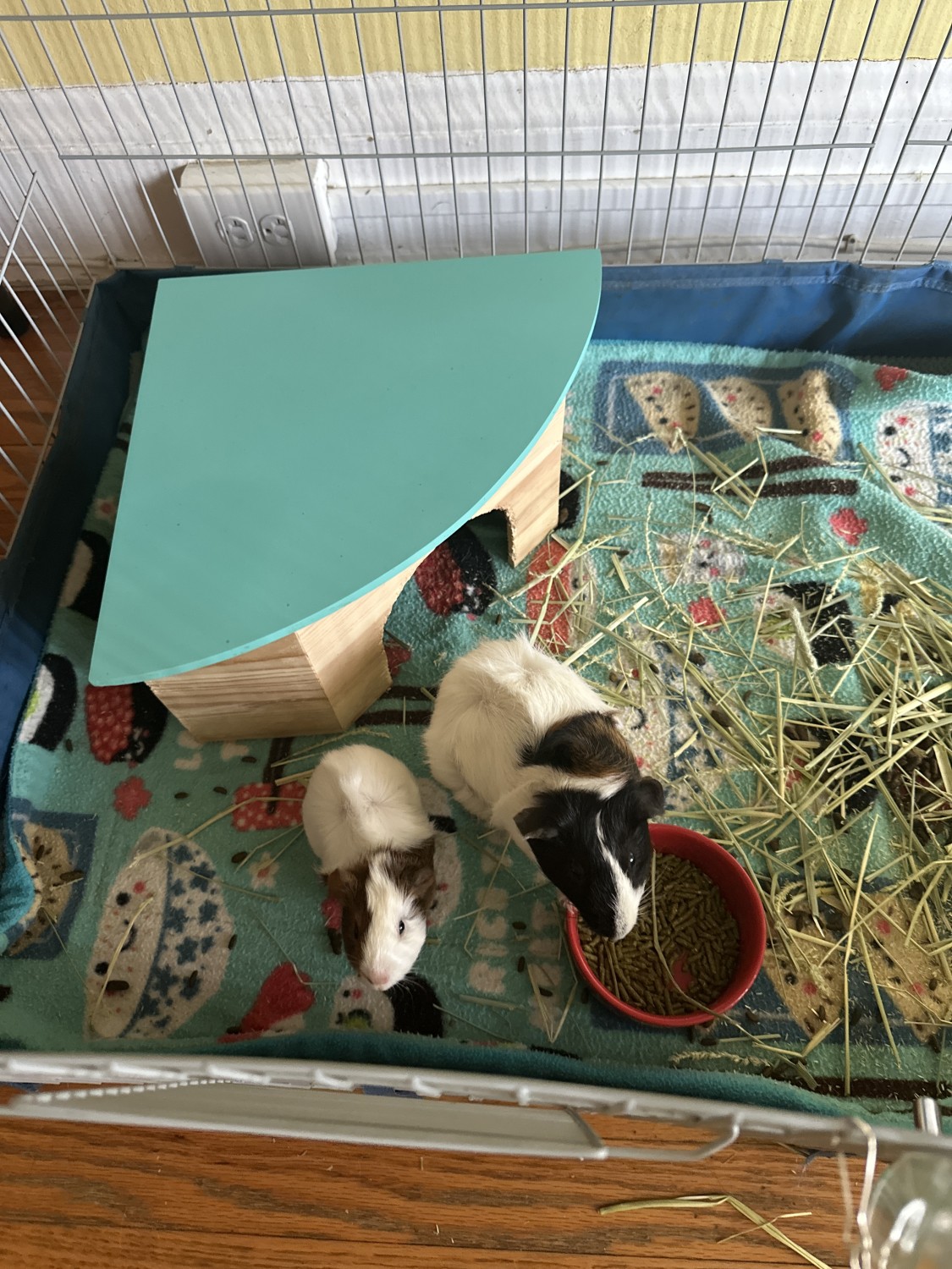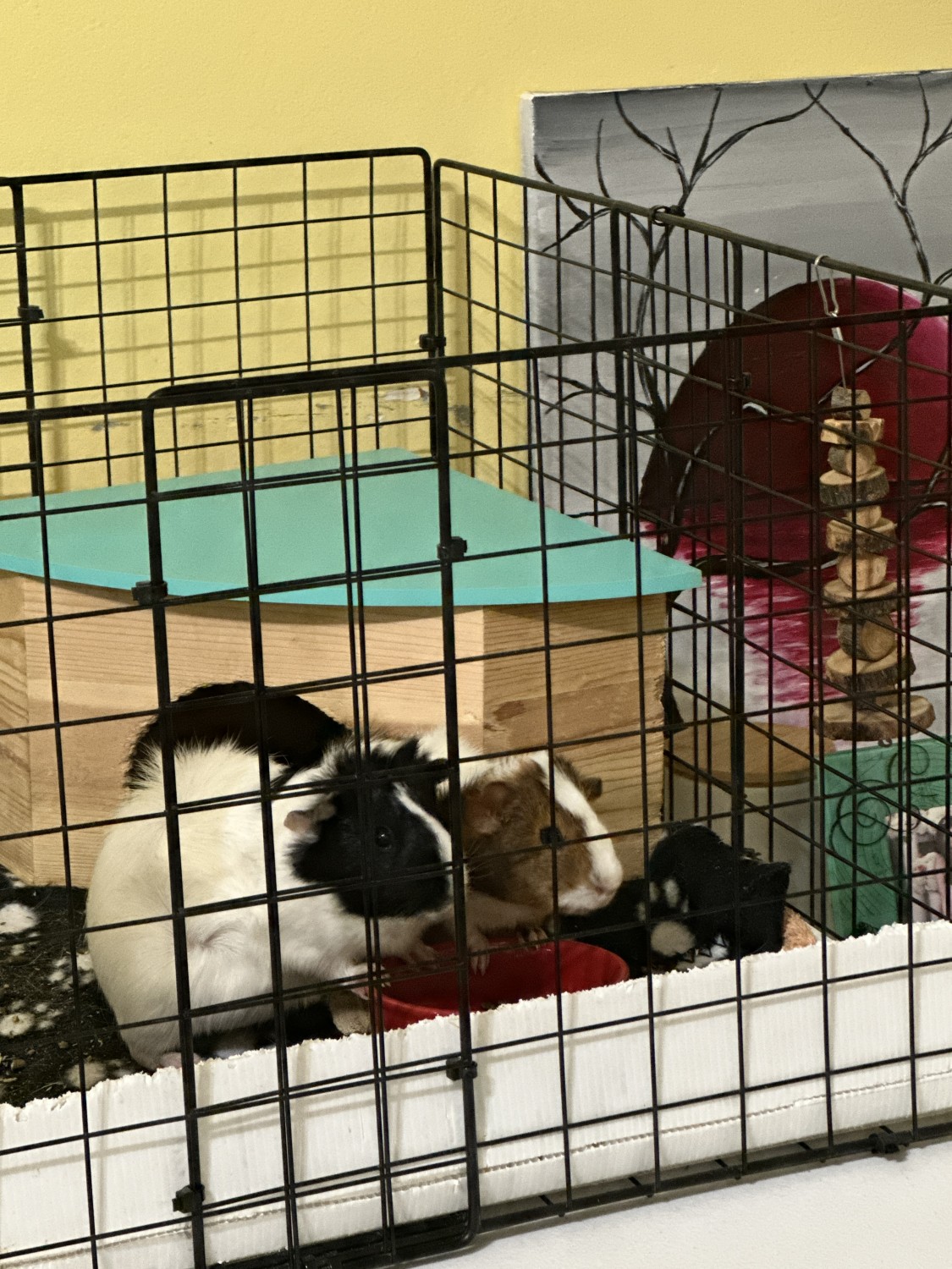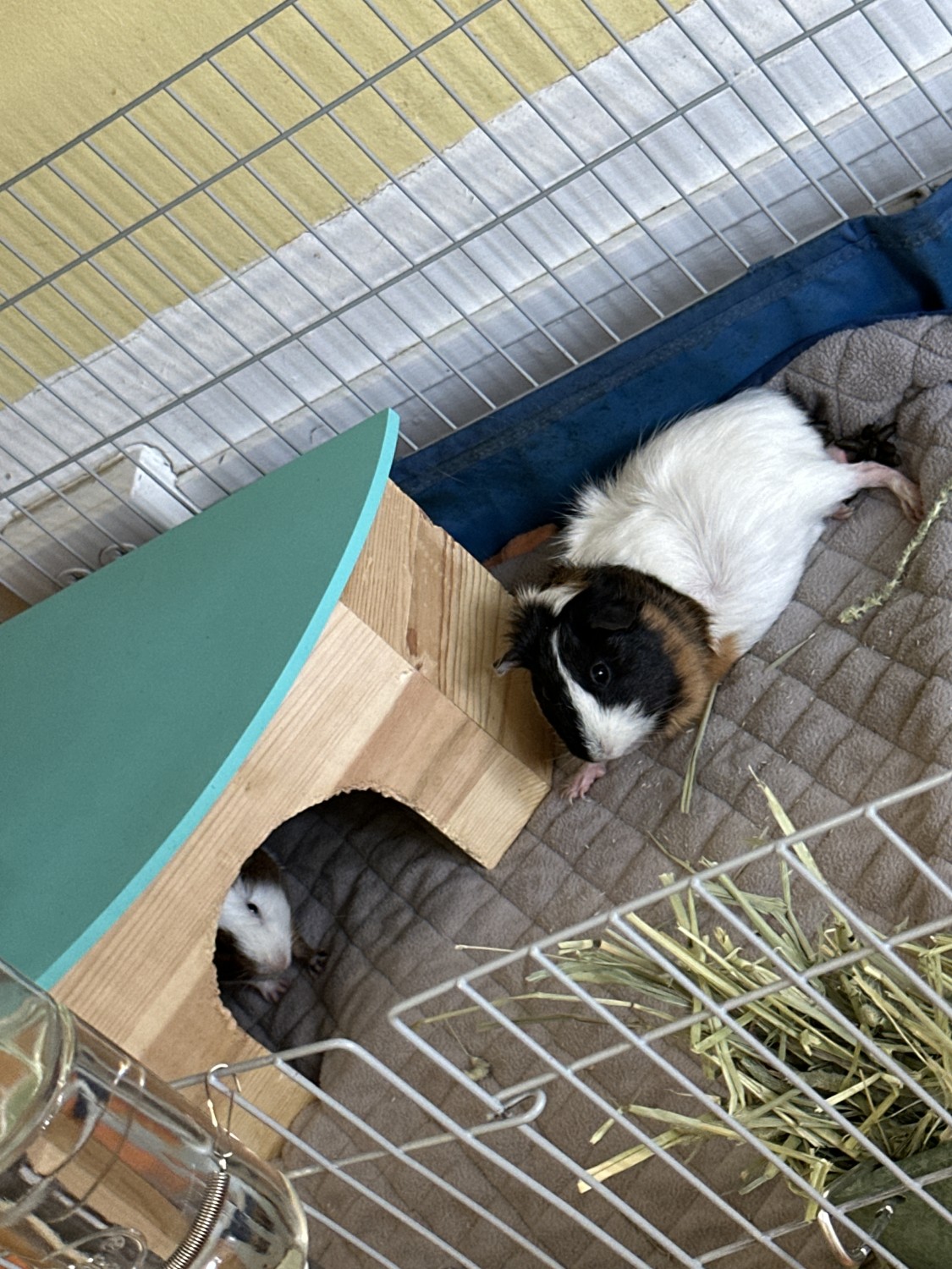 2 bonded female guinea pigs. They are mother and daughter. Mother is adult roughly 2 years old and daughter is 1 year old.