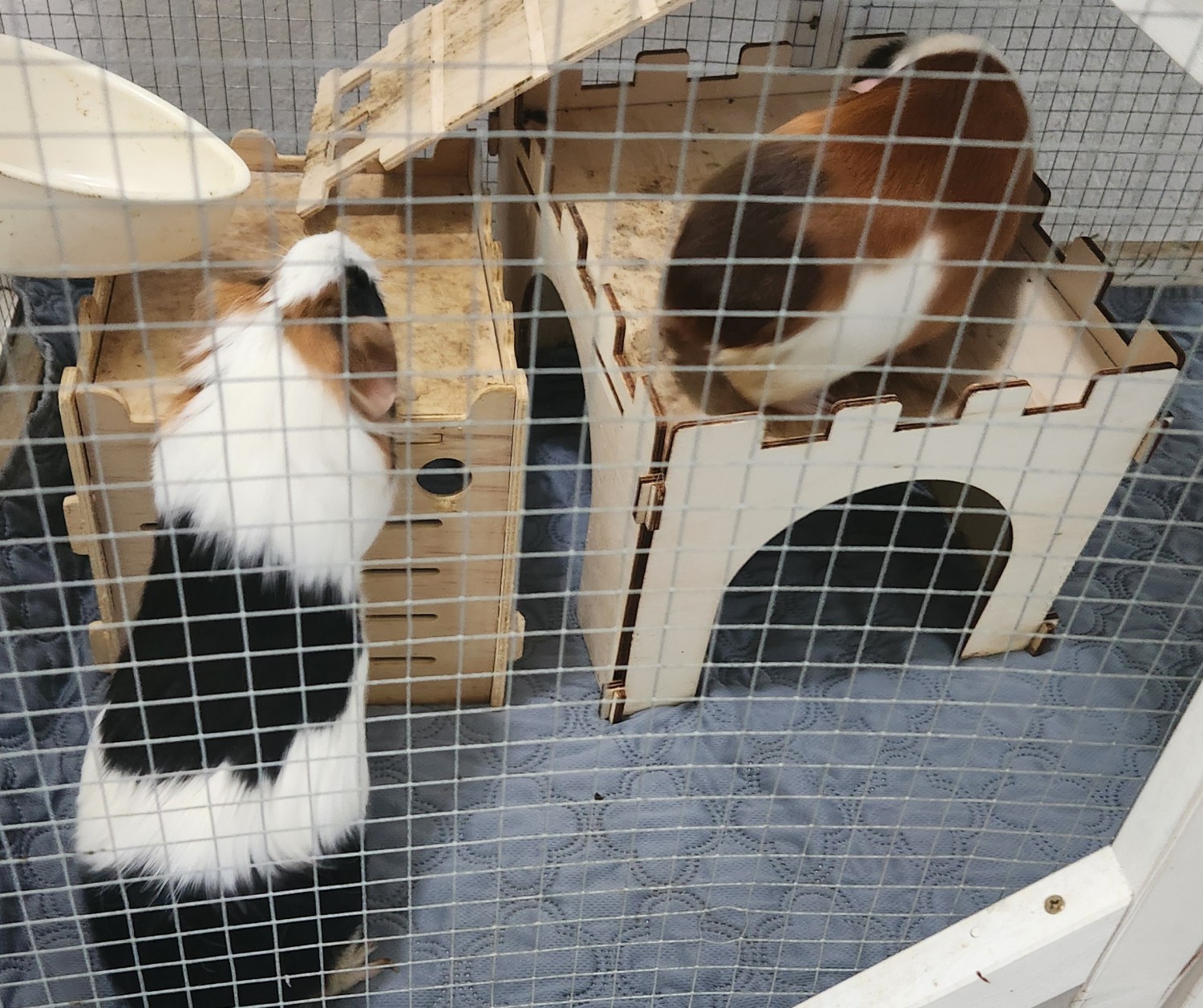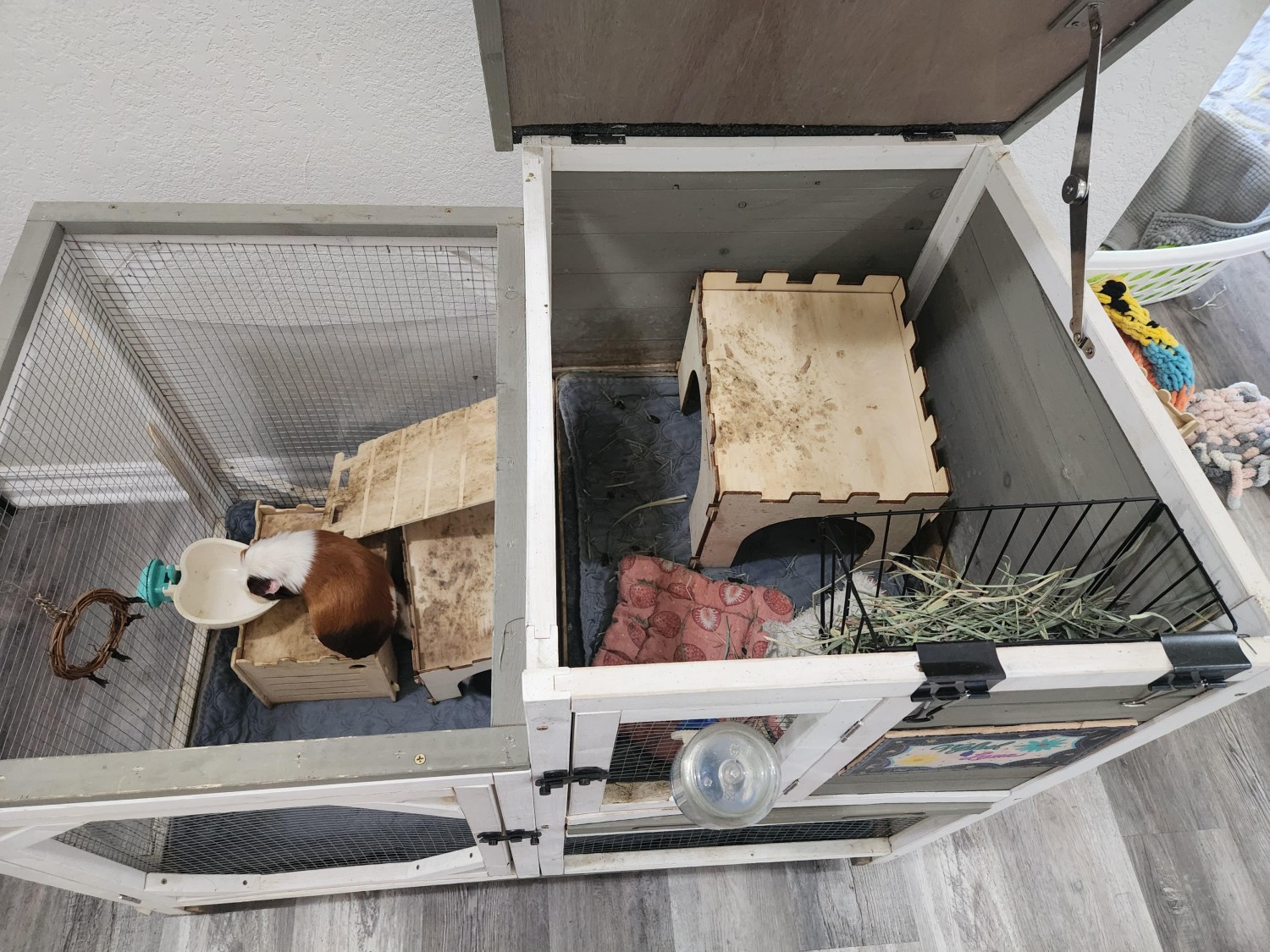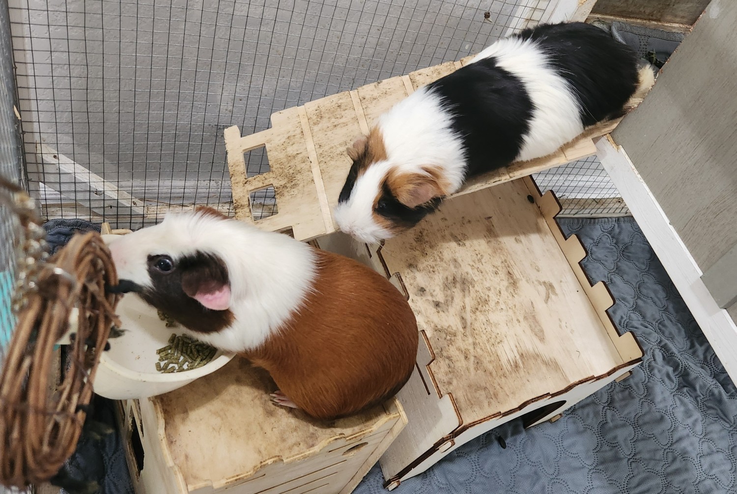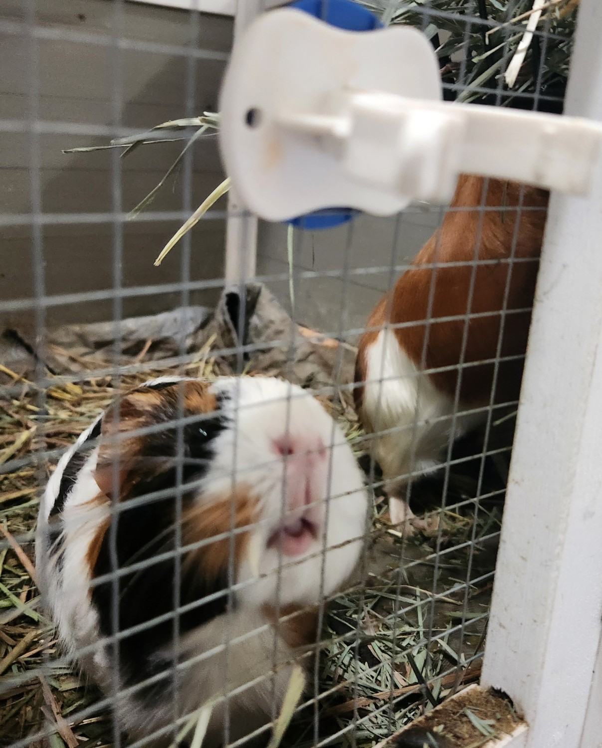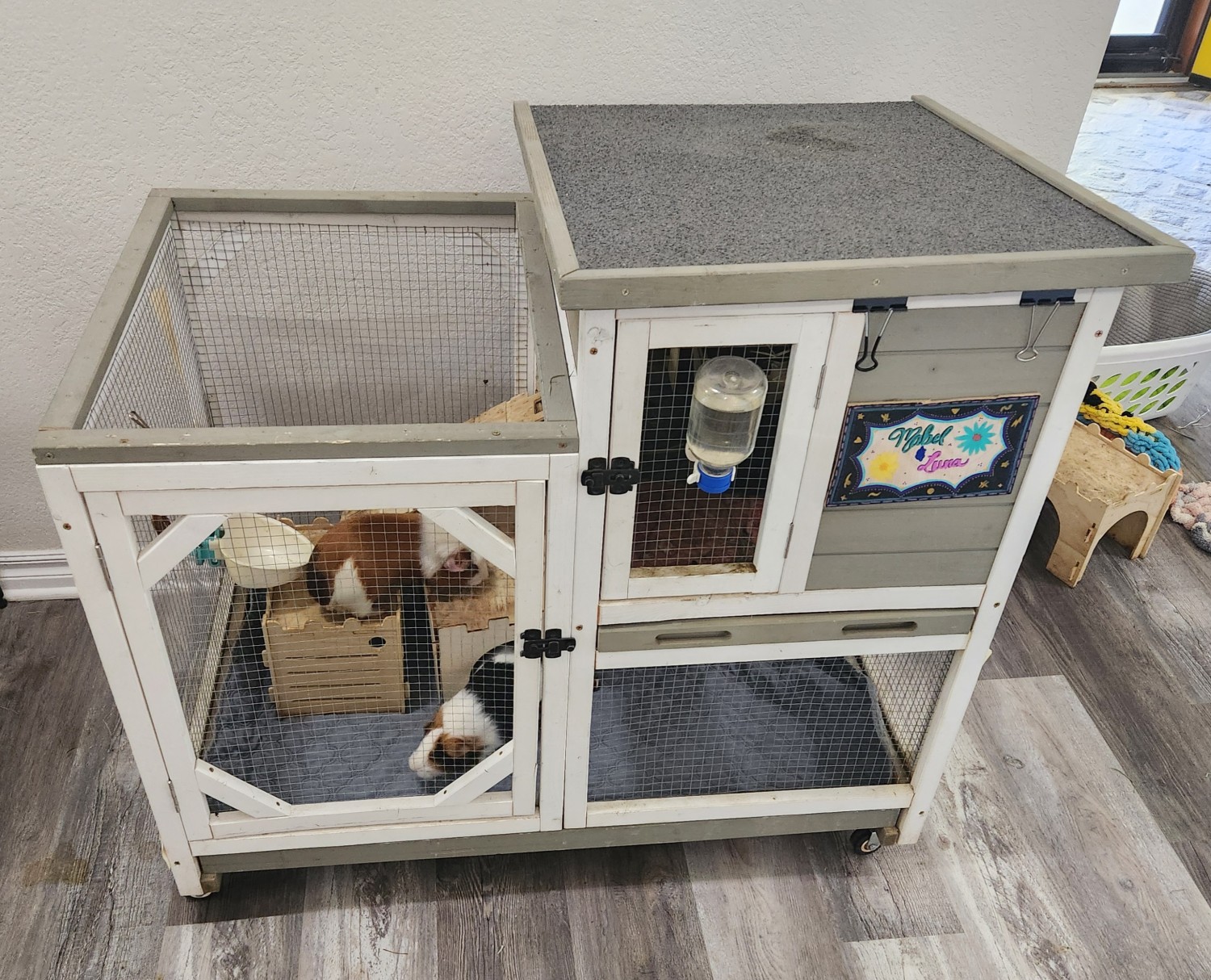 We adopted these 2 girls, Mabel and Luna, as babies in Oct 2024. They are healthy and happy. They will "wheek" at us when we get home and when they want a snack. They tend to scoot away when they are being picked up but are gentle and like to be held and cuddled. To their new home it it is helpful we will include all this at no additional cost the 2 story (40L 26W 37H inches) wooden enclosure on wheels, any remaining hay, and pellets we have. As well as the wooden hideouts and bridges, and feeders. We hope the piggies will be happy with you in your home.