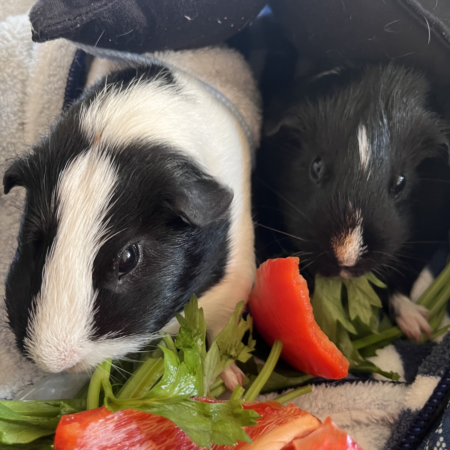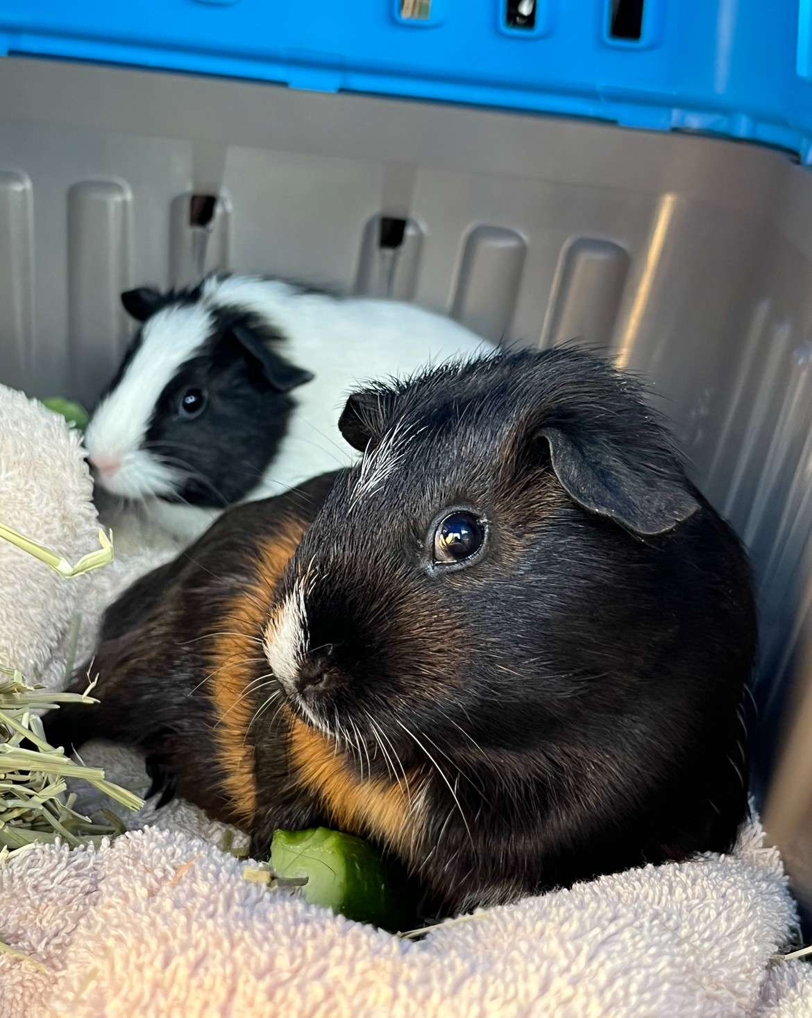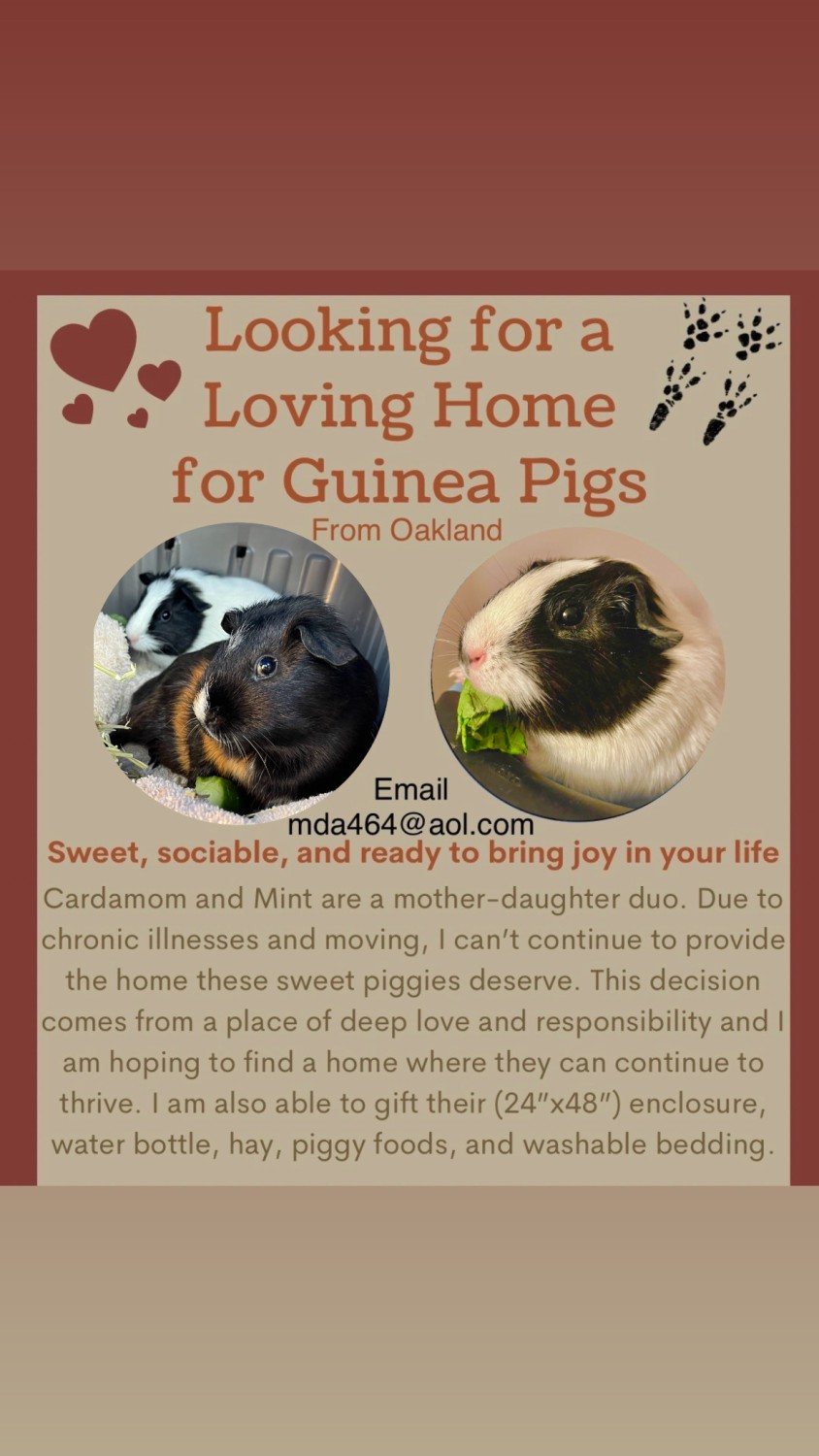 An ideal adoption - Sweet, sociable, and ready to bring joy in your life Cardamom and Mint are a mother-daughter duo. Due to chronic illnesses and moving, I can't continue to provide the home these sweet piggies deserve. This decision comes from a place of deep love and responsibility and I am hoping to find a home where they can continue to thrive. I am also able to gift their (24"x48") enclosure, water bottle, hay, piggy foods, and washable bedding. They are both healthy and about 3.5 years old (Cardamom was rescued while pregnant with Mint very young, so they are close in age and will likely live the rest of their lives together around the same time). They are friendly and like to be held, they are easy going, food motivated, loving, and easily entertained.