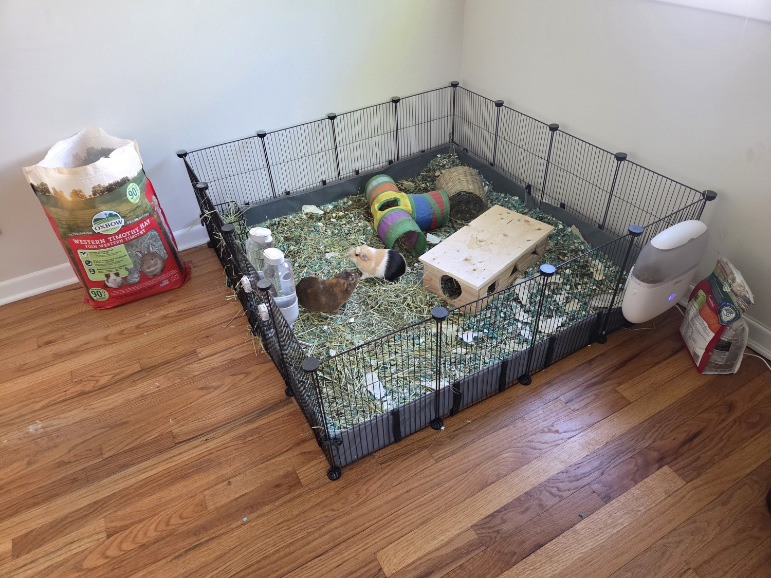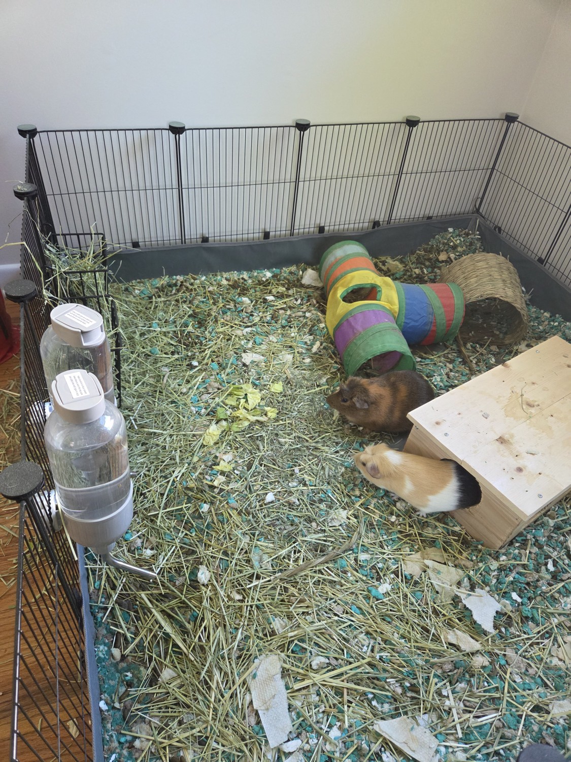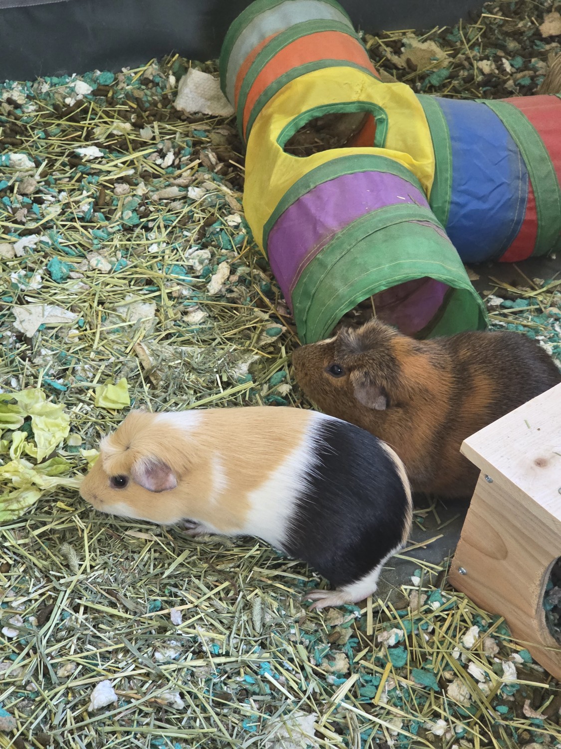 2 absolutely lovable, bonded, about 8 month old boys sadly need to find a new home due to allergies in multiple family members. Included is the piggy pen, feeding hay boxes, 4 water bottles, automatic pellet feeder, wooden piggy house, some toys, a fleece and tarp - like pen bottom, remaining timothy hay and grass pellets.