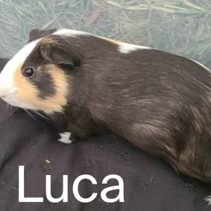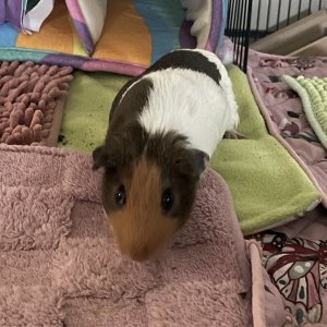 Louise is sweet and gentle and very good with children as well. Her favorite treat is carrots and she will often make cute wheeking noise when she smells them....